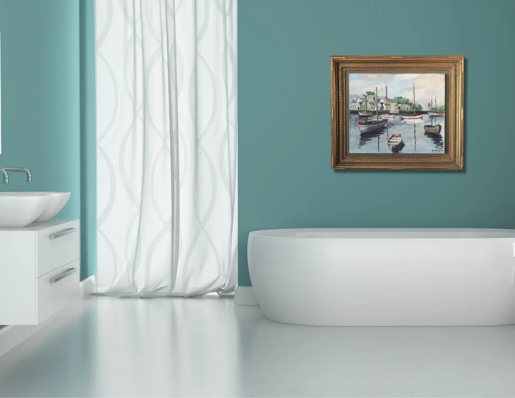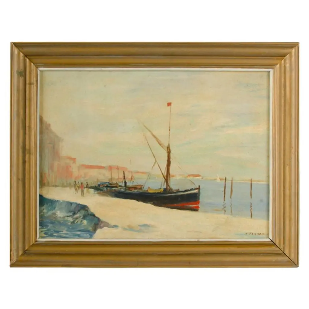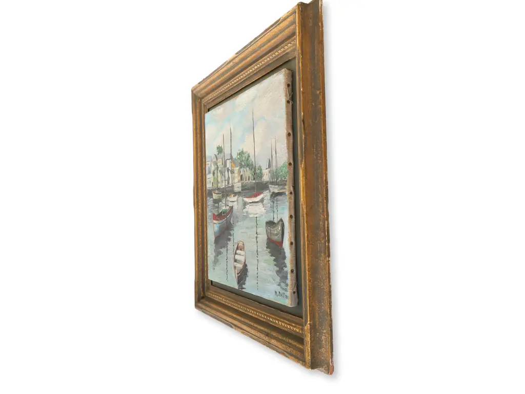 The artist's skillful use of light and color brings the scene to life, showcasing the tranquil waters and charming coastal architecture. The canvas is uniquely floated atop a mat within a custom frame, enhancing its visual appeal and adding depth. This piece is a splendid representation of traditional French coastal scenery, perfect for adding a touch of elegance and tranquility to any space.