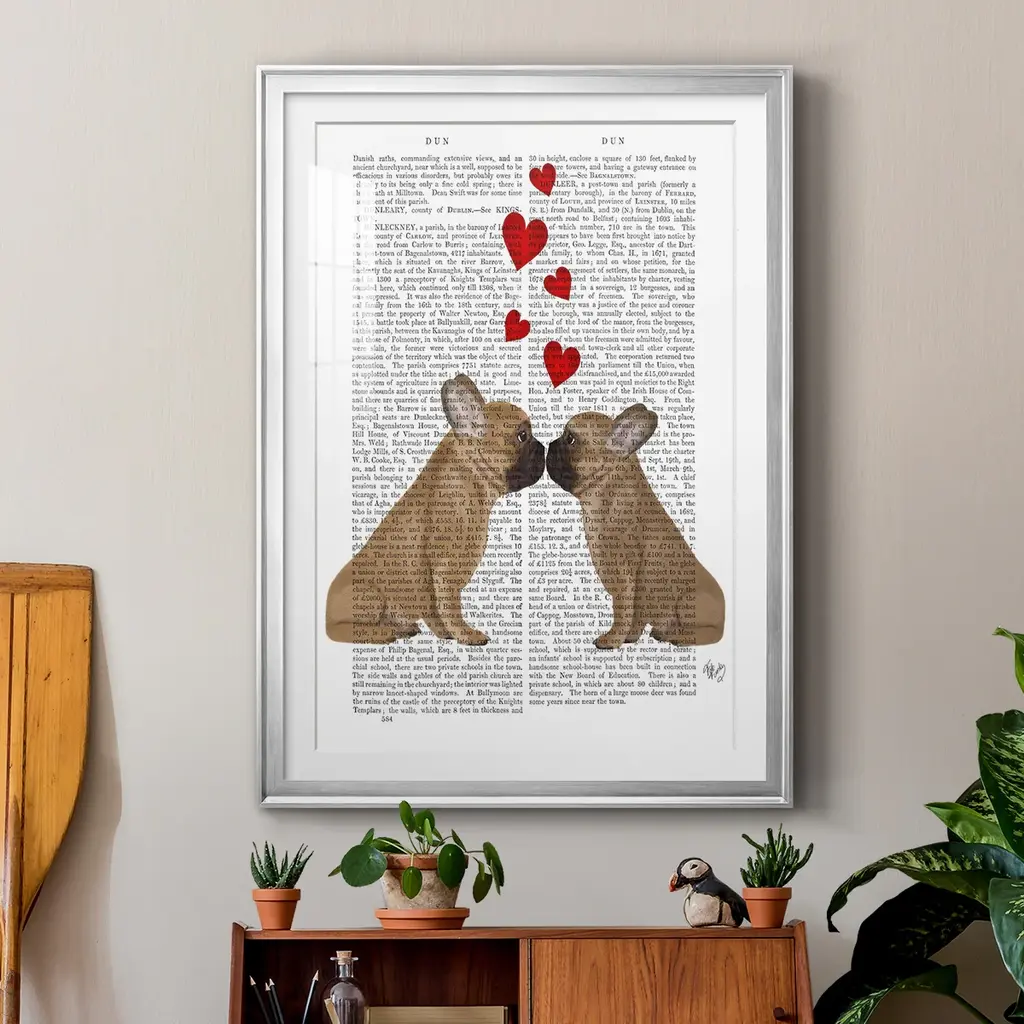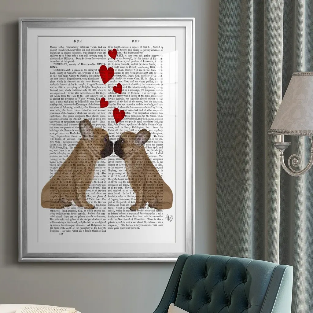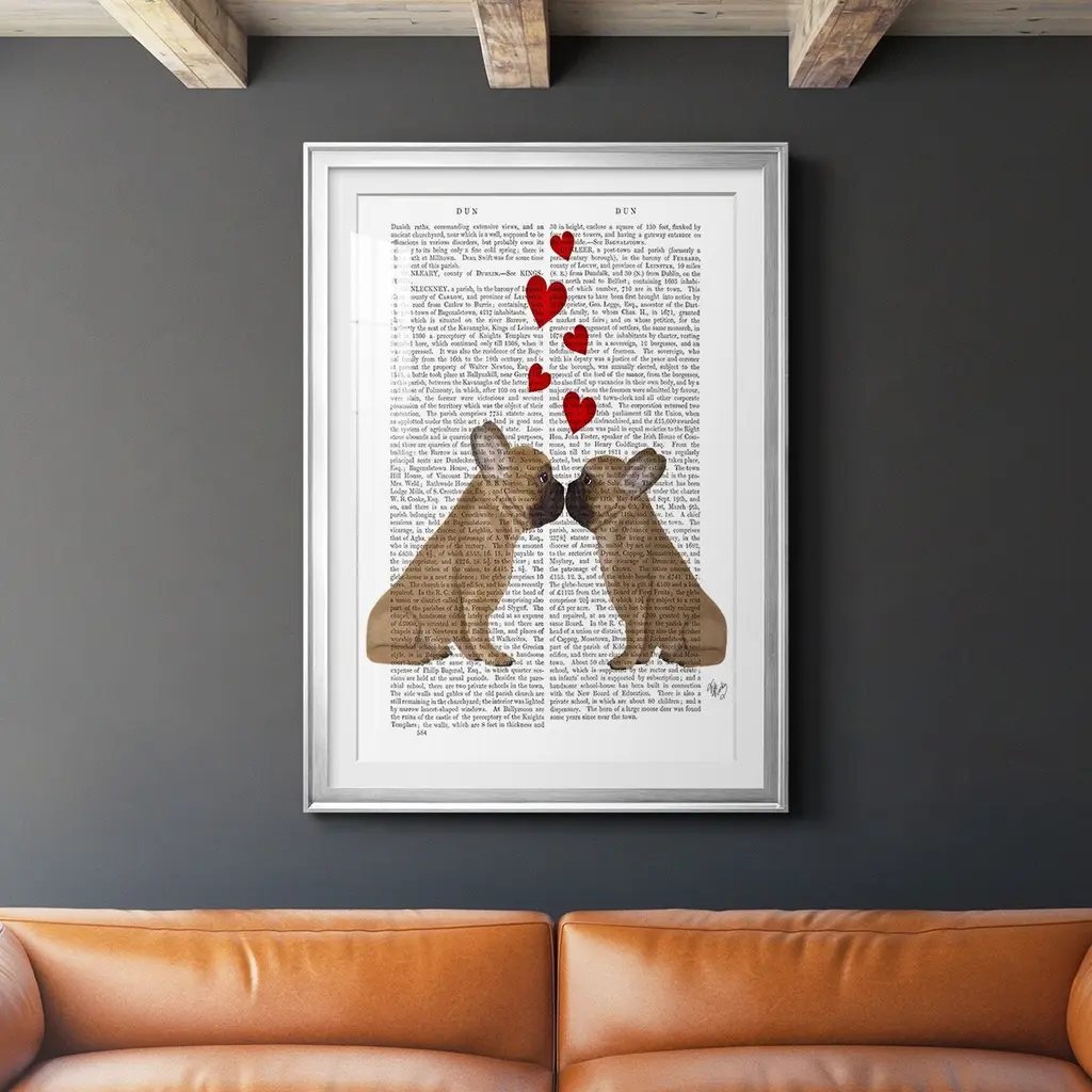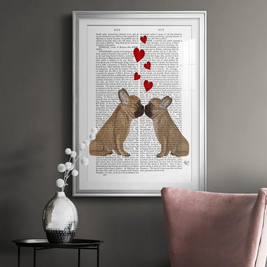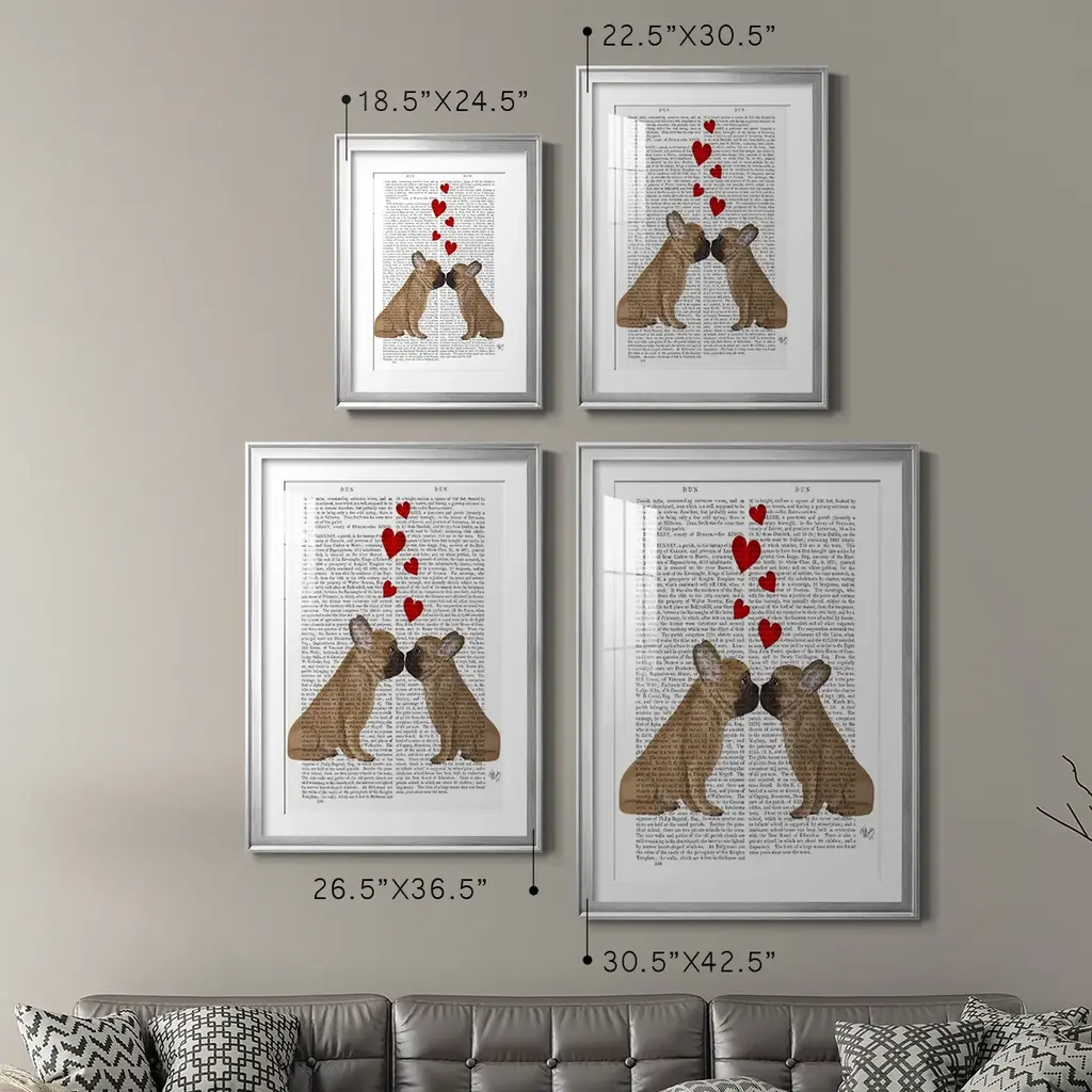 French Kiss and Hearts Premium Framed Print - Ready to Hang A Premium Framed Print created to last. Framed in distressed wood and available in an array of sizes and colors Featuring a beveled a solid wood stretcher bar, each piece comes ready to hand 4 SIZES AVAILABLE 30.5''X42.5'' - Overall Size 26.5'X36.5'' - Overall Size 22.5''x30.5'' - Overall Size 18.5''x24.5'' - Overall Size Each piece is made to order. Each piece comes with hanging hardware. Made in the USA Ready to Hang Giclee Paper Print Acrylic Glass Beveled Matt Board