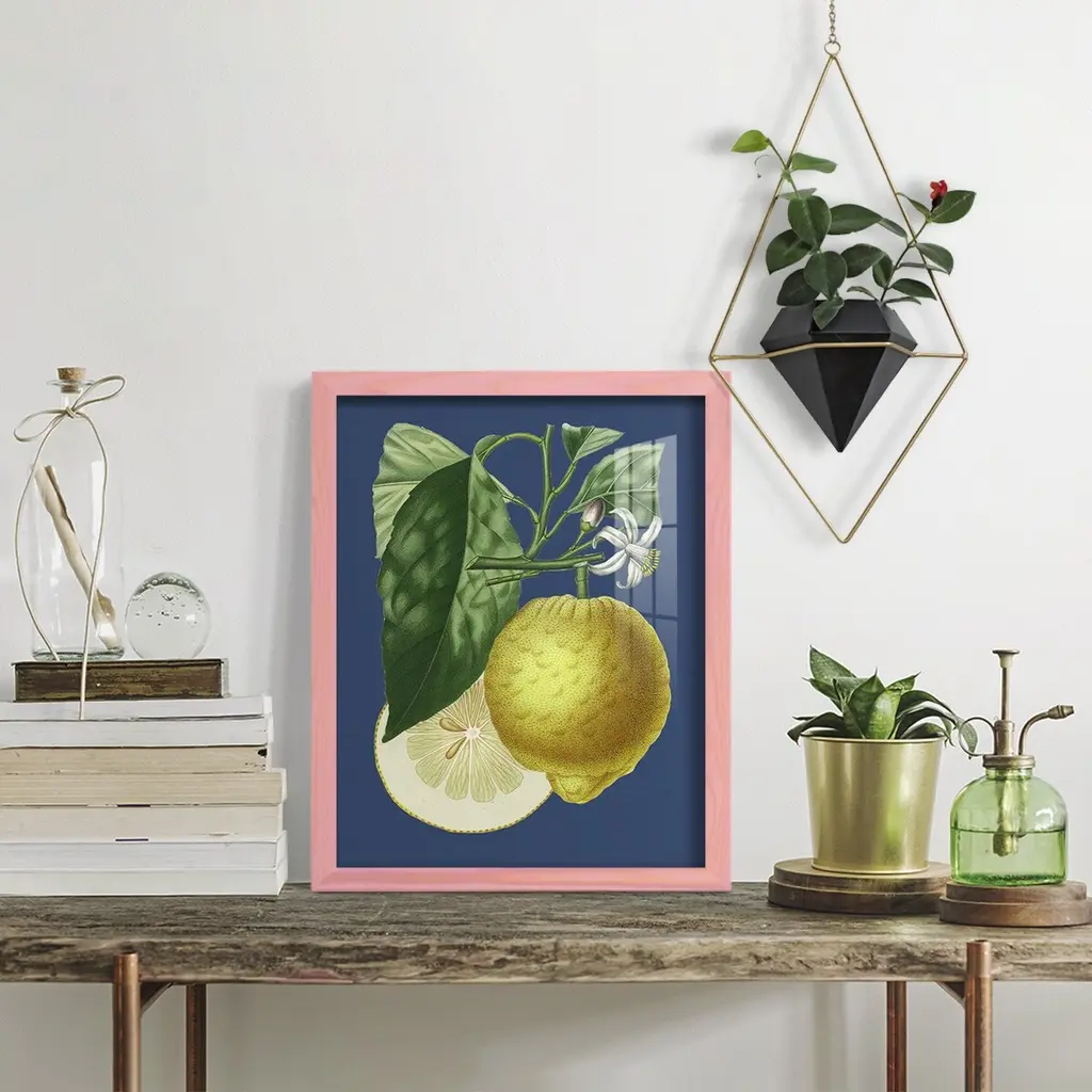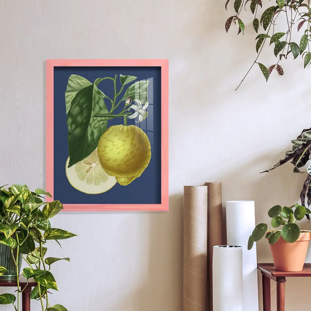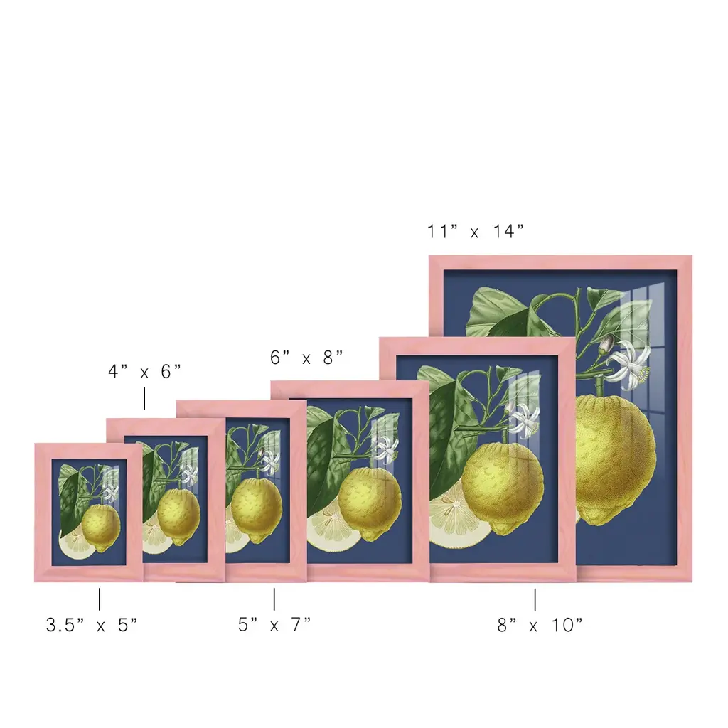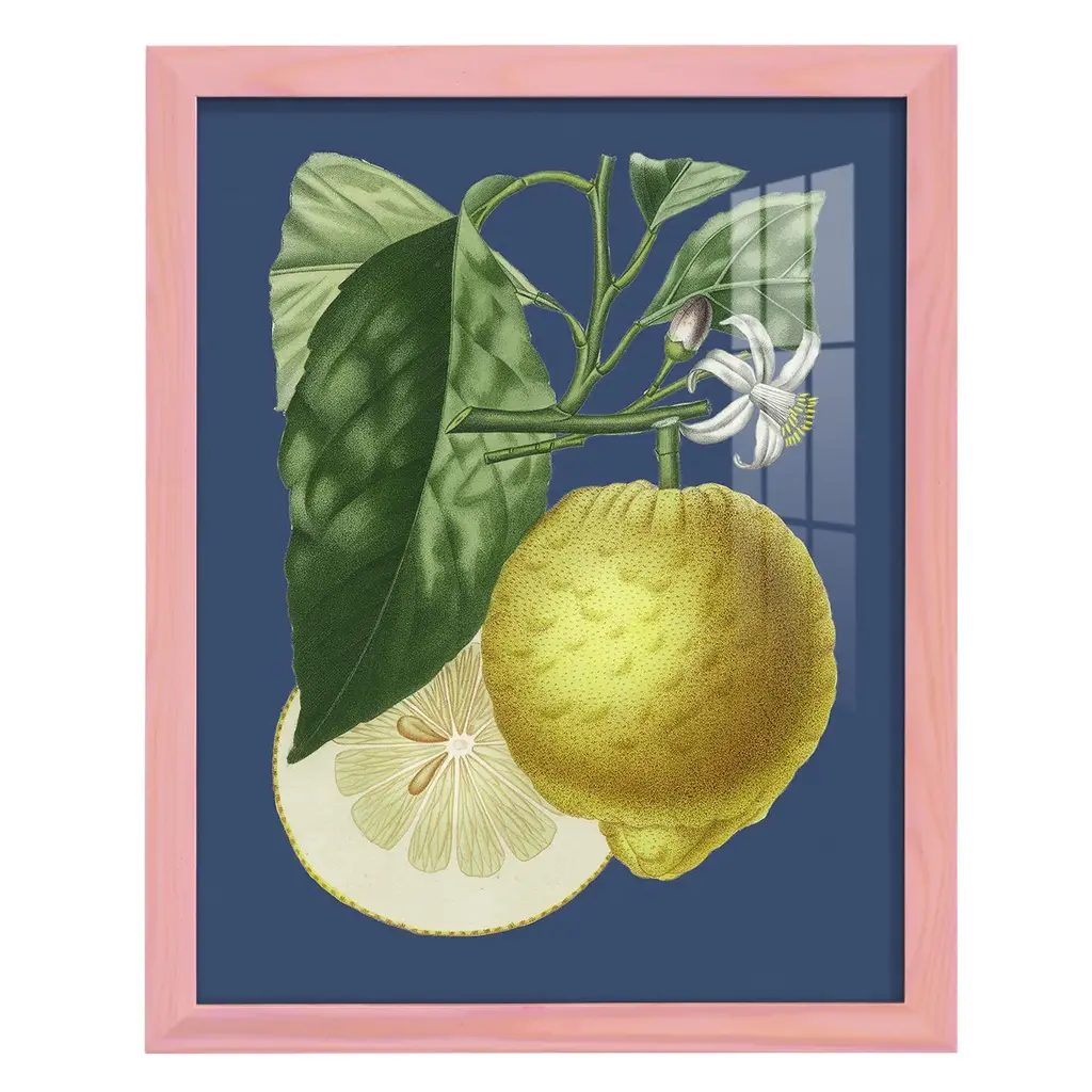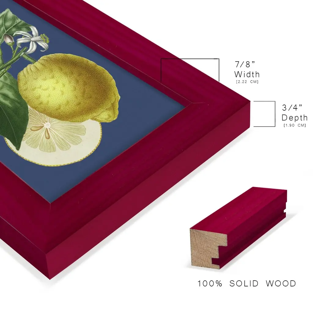 French Lemon on Navy I -EZ SWITCH Framed Print w/glass-Cherry Red A delightful, framed print. Featuring a solid wood frame with real wood glass. This premium print is giclee quality. In addition, every frame features a removable back and table top stand. This allows you to change your art in the future or to just stand the art on a table for a new look. We are sure you'll enjoy our new series of EZ SWITCH Framed Art. Solid Wood Frame Real Glass Removable / Replaceable Art Built in Tabletop Stand Sizes range from 4x6 up to 12x15 - buy just one or pair them up as sets as you see fit.