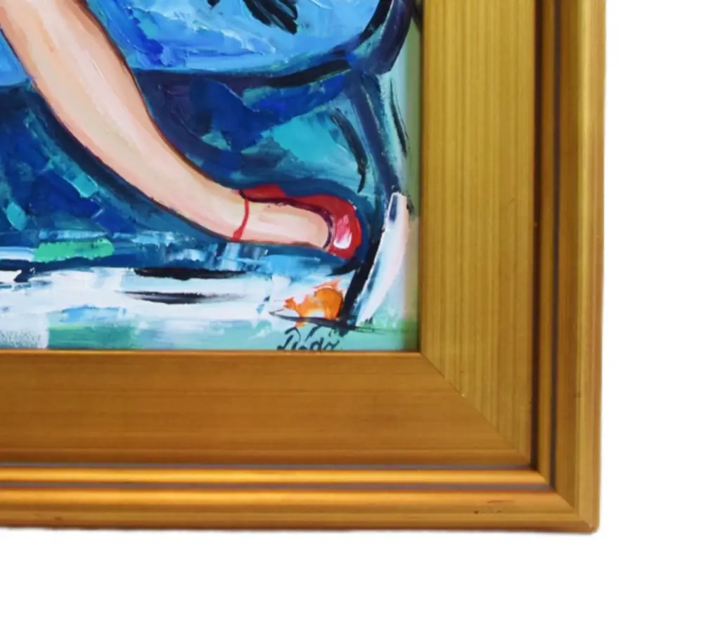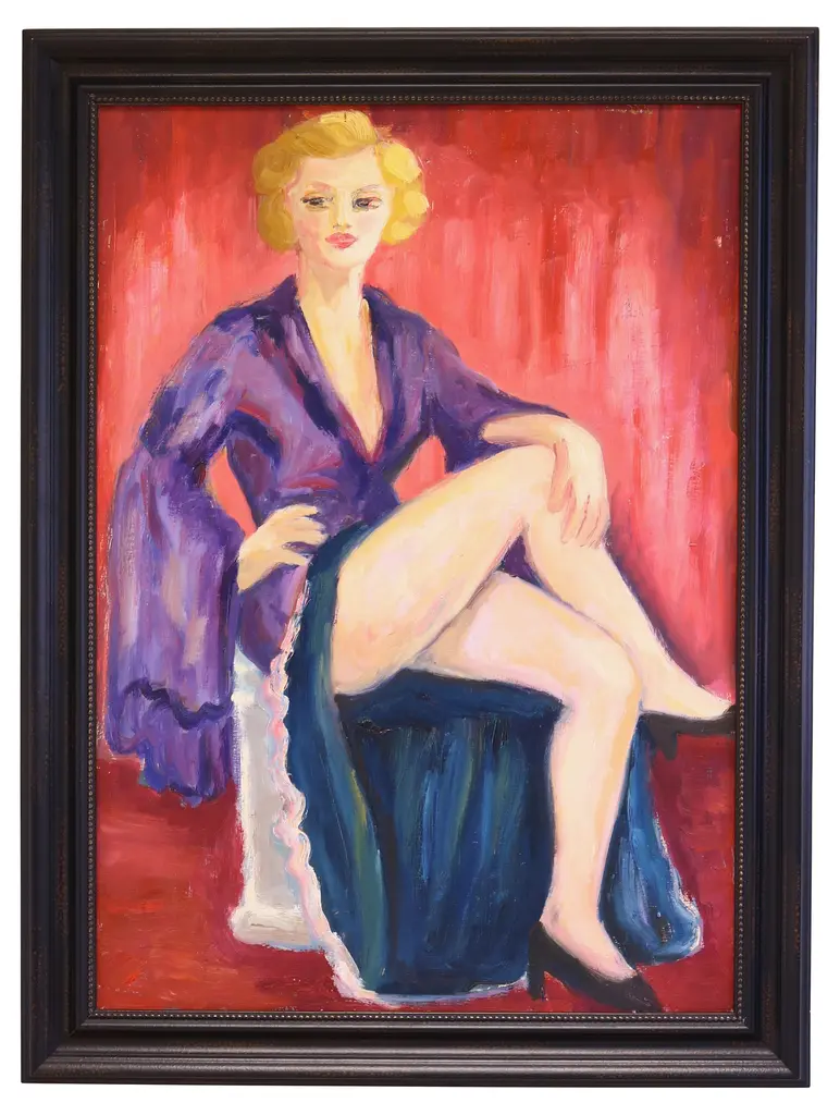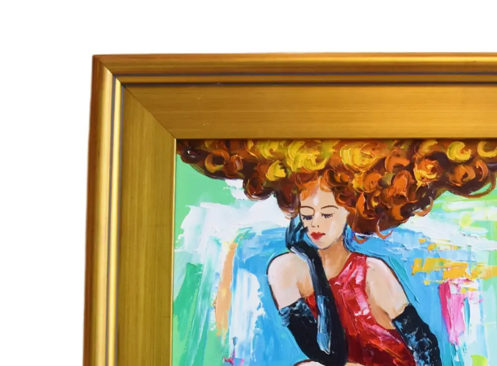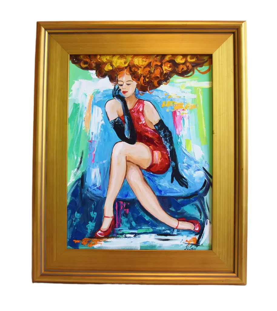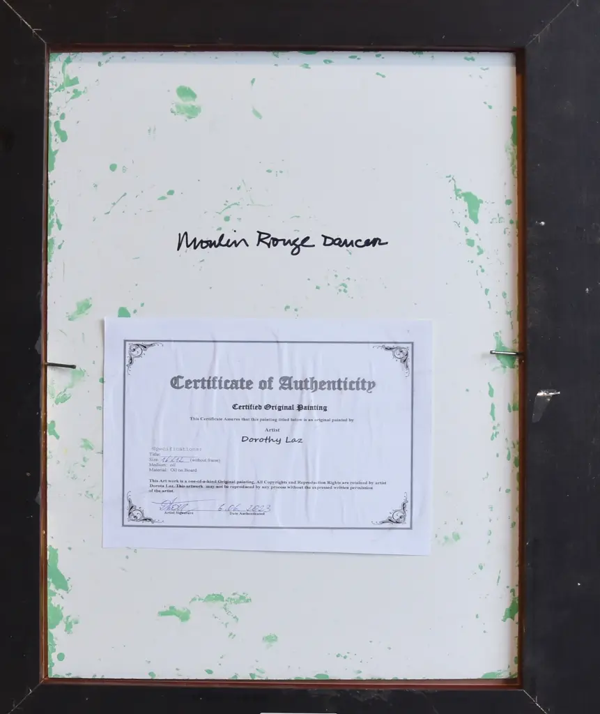 Contemporary original one-of-a-kind impressionist portrait oil painting on artist��s panel of a beautiful stunning red headed French Parisian Moulin Rouge Féerie Revue show cabaret dancer relaxing backstage. Signed by the talented artist ���Dorothy Laz���� lower right corner and on the reverse. Includes the antiqued gold wood frame and hanging hardware/wire. Dimensions: Artwork, 12"L x 16"H; overall, including the frame, 17"L x 21"H. Excellent, beautiful condition!!!!