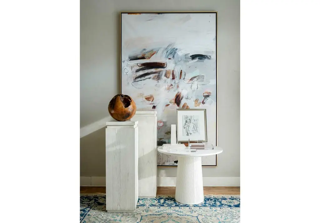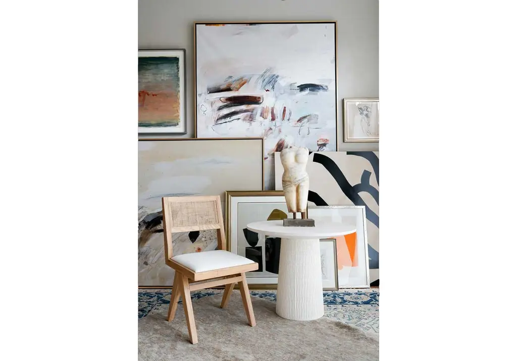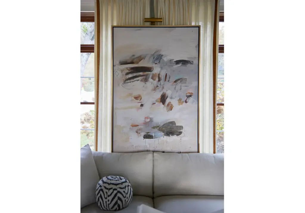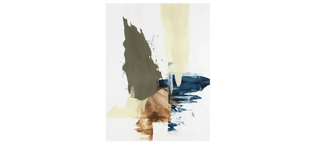 Featuring an interesting mix of bold strokes, shapes, and drips, this abstract artwork is an eye-catching addition. Its blend of dark and neutral tones lends visual dimension and color. A floating gold frame provides an added touch of sophistication, creating a piece that makes a statement in any space.