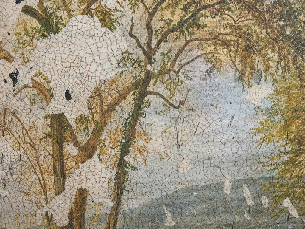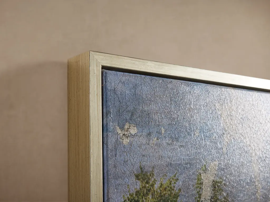 Giclee printed on canvas accentuated by artist embellishment, Fresco Countryside makes a statement with its stunning landscape and unique accents. Its visually textured design, complemented by a champagne wooden frame, this piece adds a timeless look. Giclee print on canvas. Wooden frame features a champagne finish. Hangs horizontally with back-mounted D-rings.