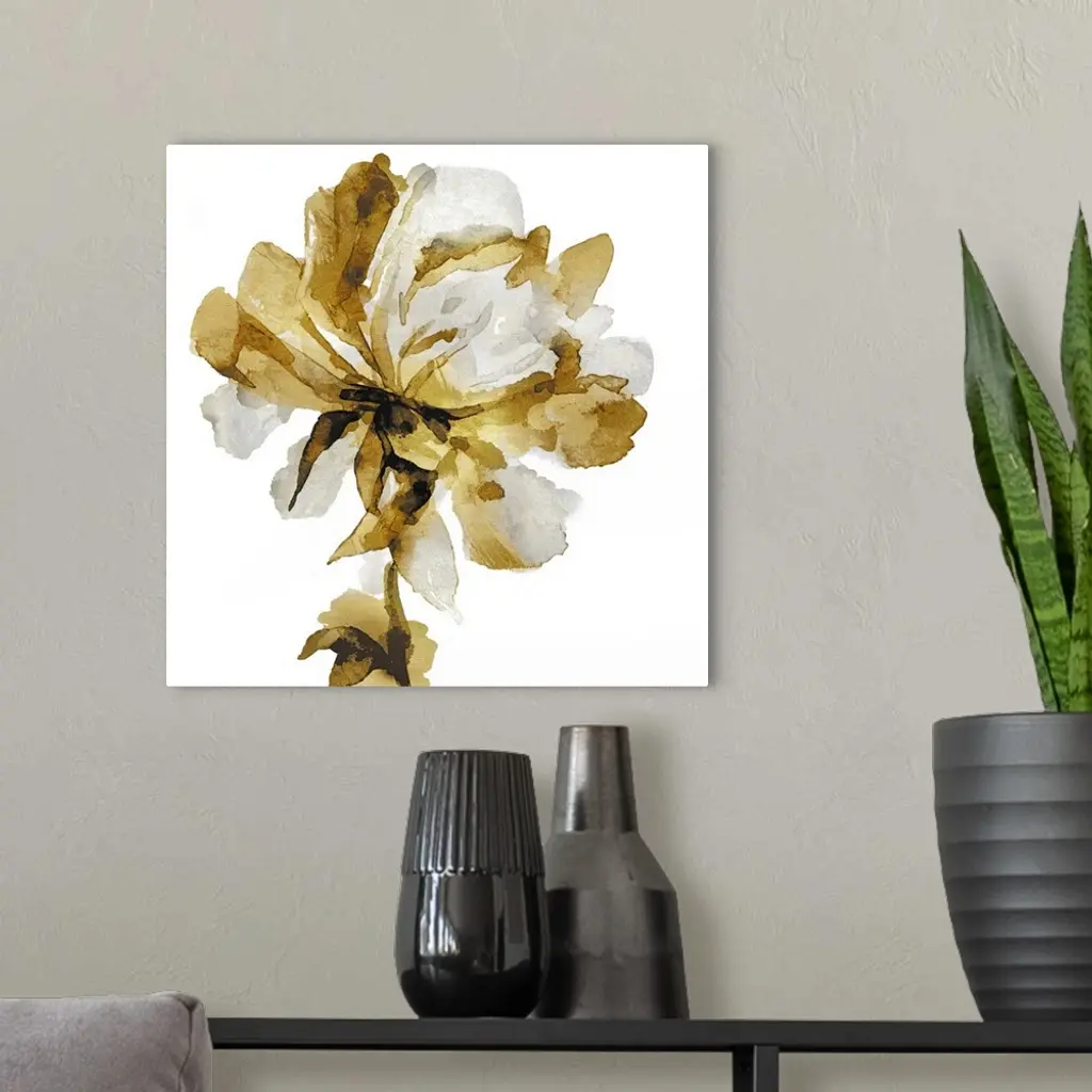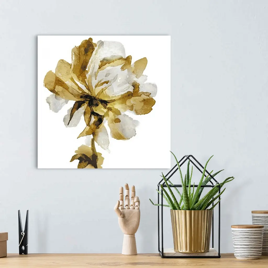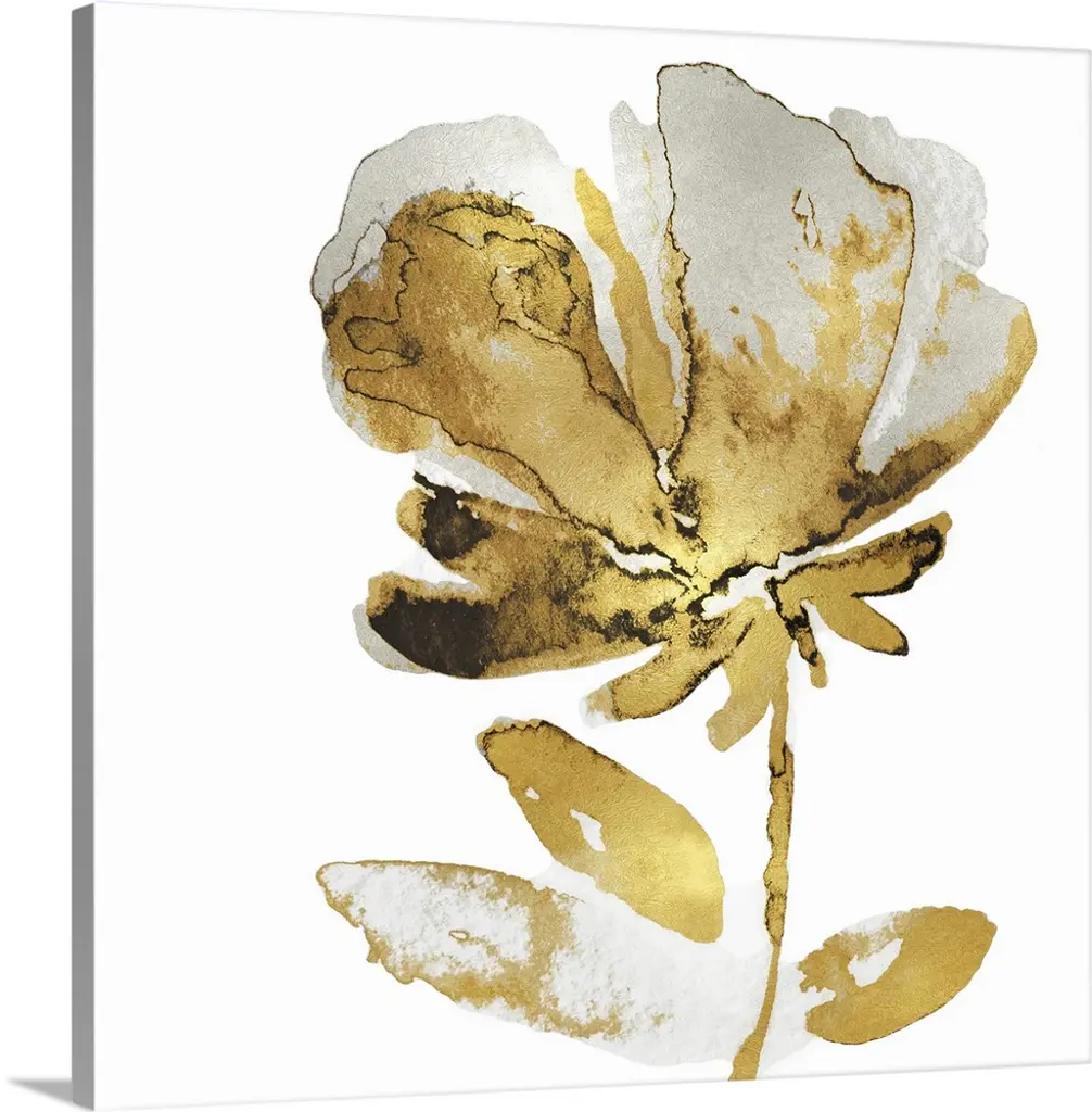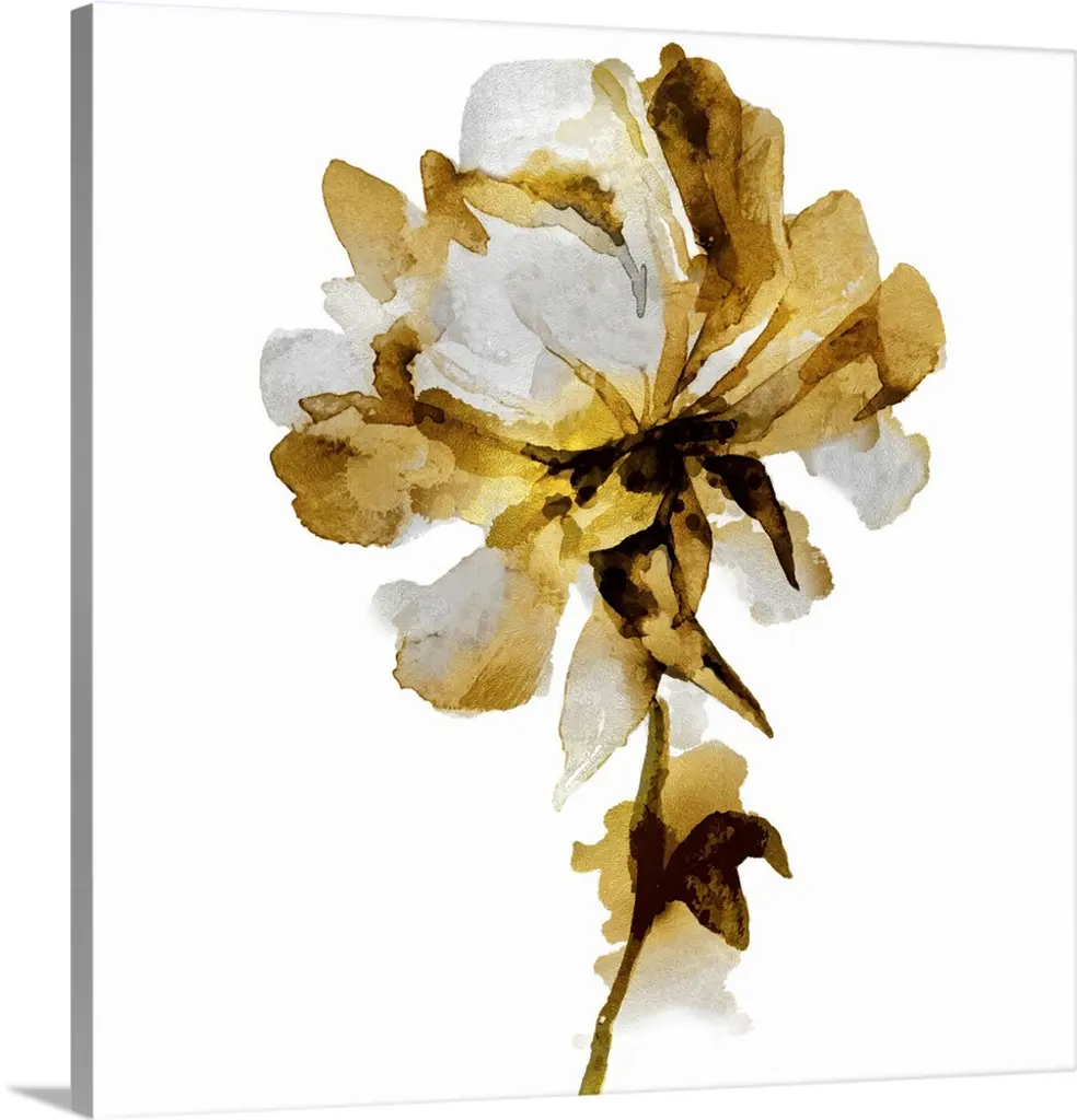 This contemporary artwork features a single golden bloom with gray petals over a white background.