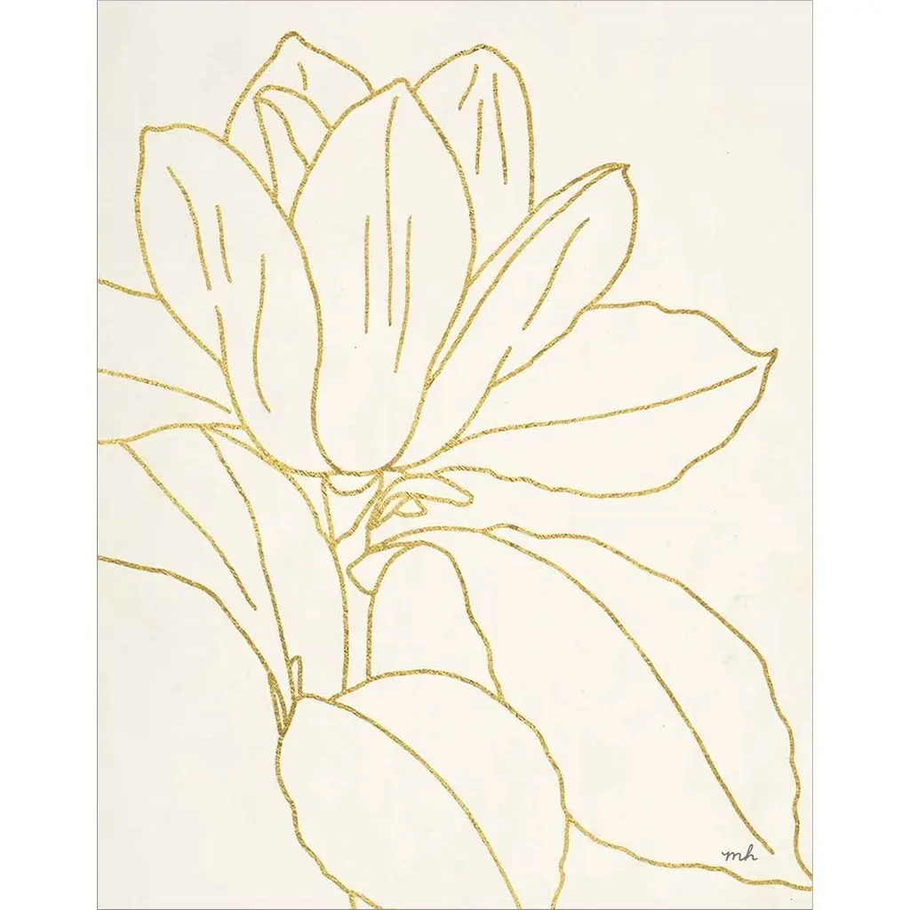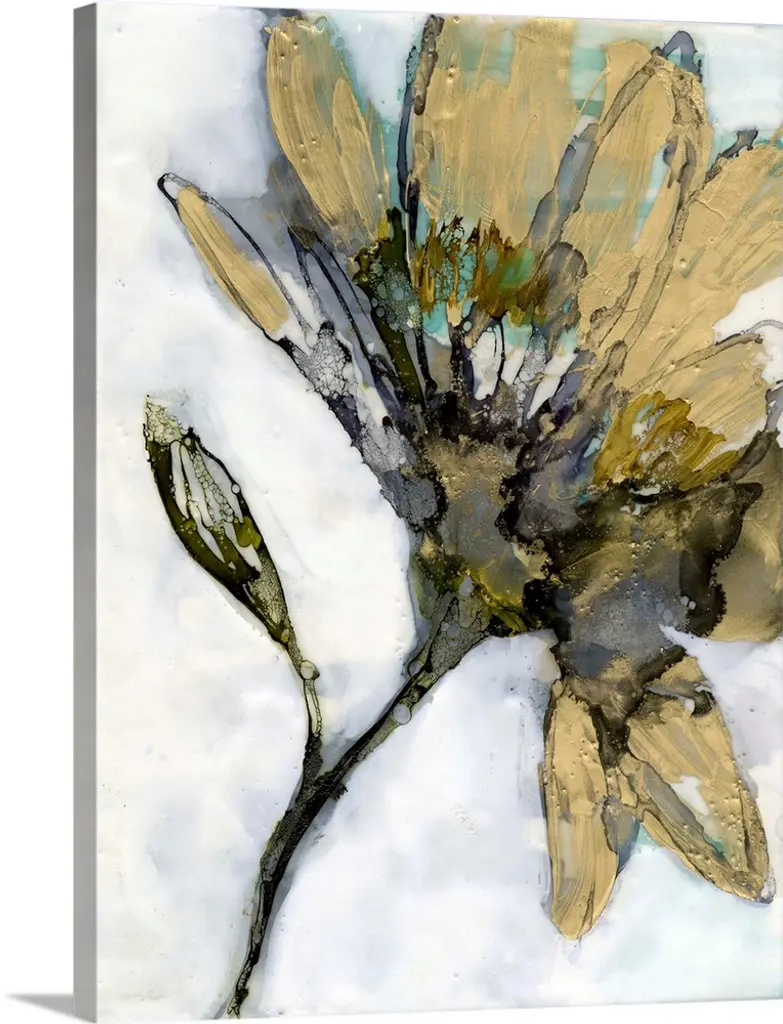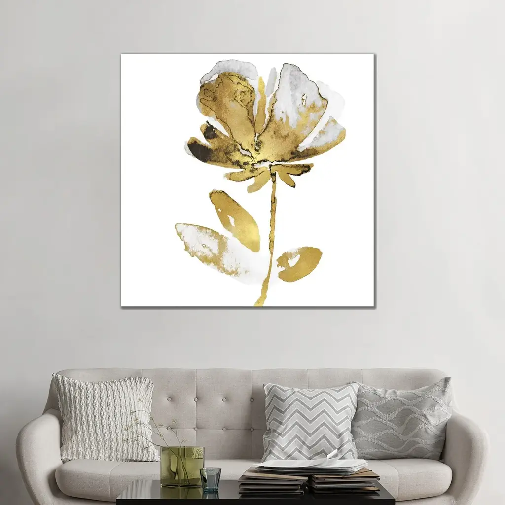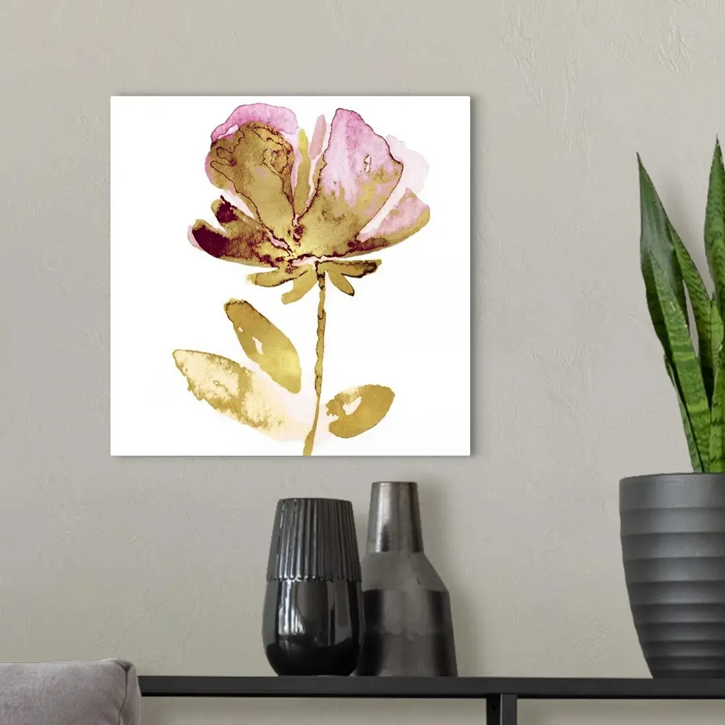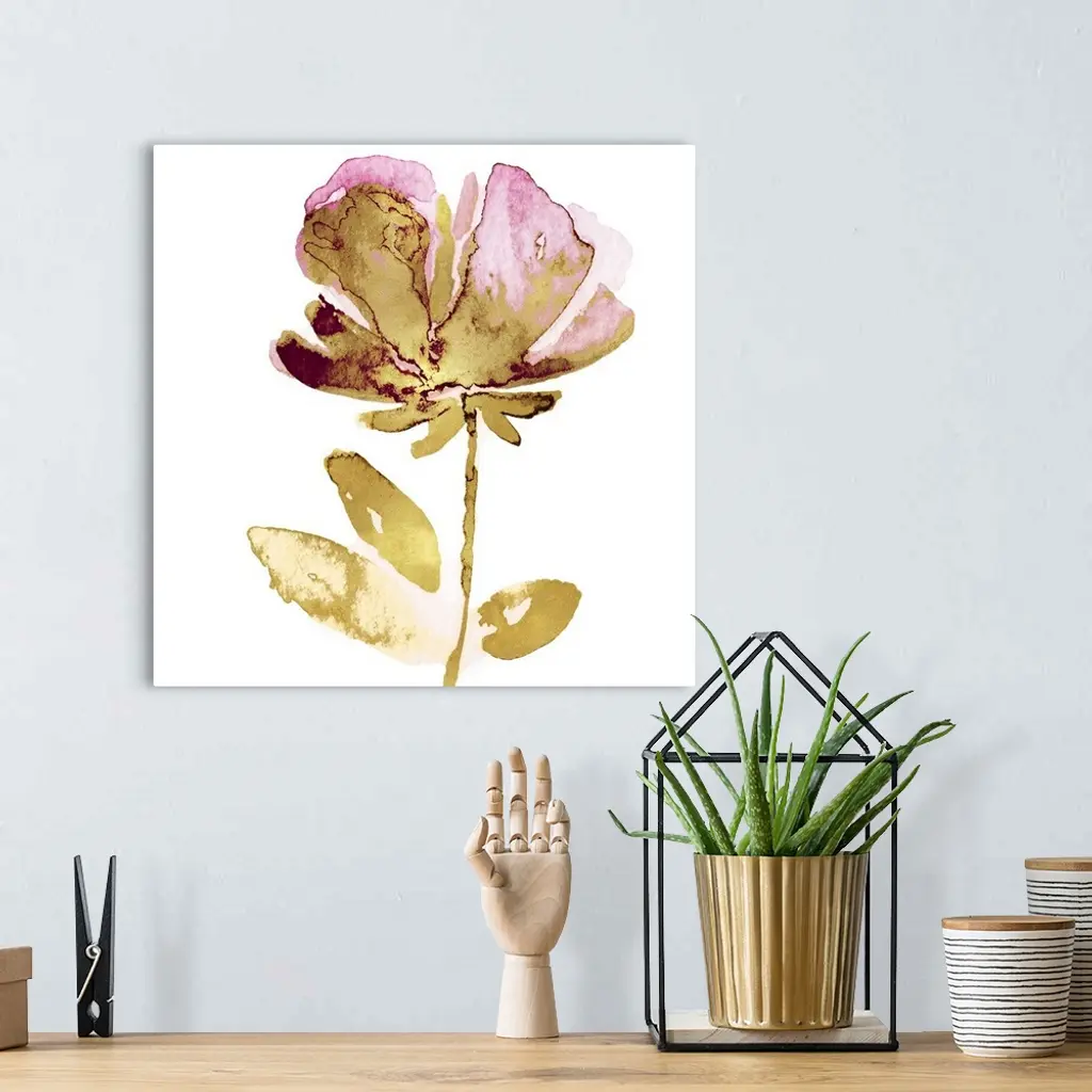 This contemporary artwork features a single golden bloom with pink petals over a white background.