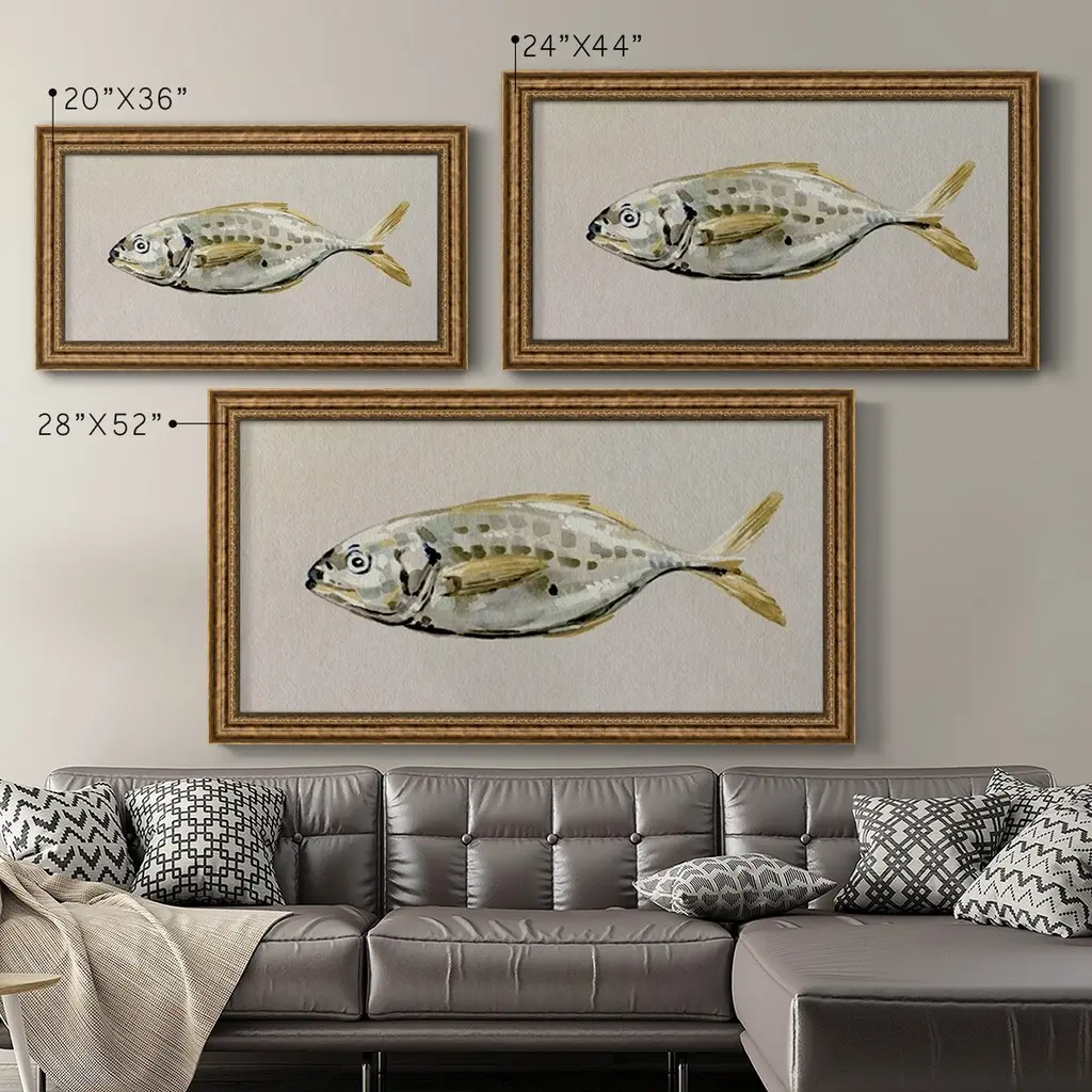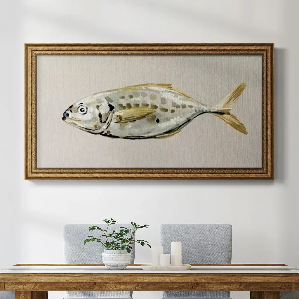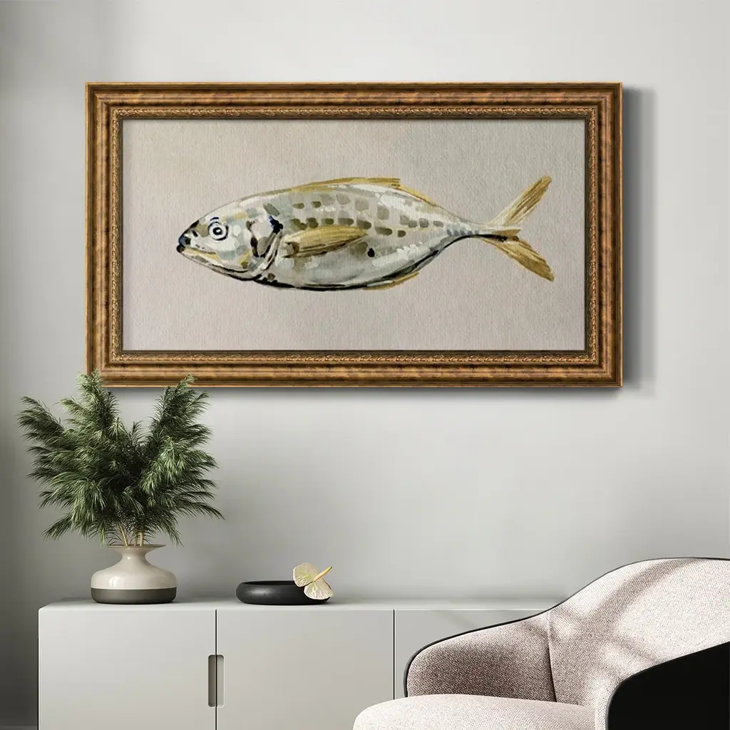 Fresh Fish Study II Premium Framed Canvas- Ready to Hang A Premium Framed Canvas created to last. Framed in distressed wood and available in an array of sizes and colors Featuring a beveled a solid wood stretcher bar, each piece comes ready to hand 3 SIZES AVAILABLE 21''X37'' - Overall Size 25''X45'' - Overall Size 29''x53'' - Overall Size Each piece is made to order. Each piece comes with hanging hardware. Made in the USA Ready to Hang Giclee Paper Print Acrylic Glass Beveled Matt Board