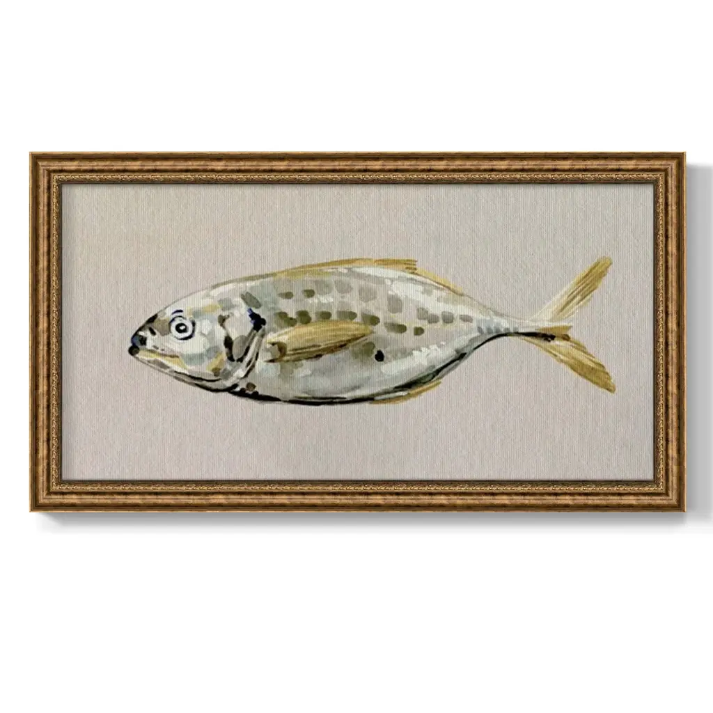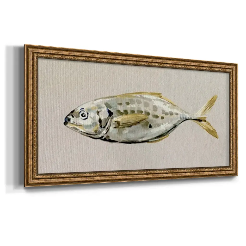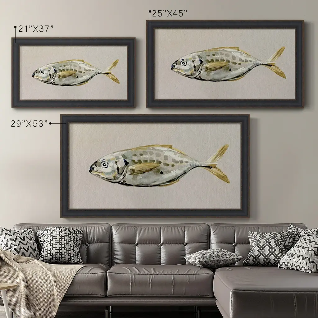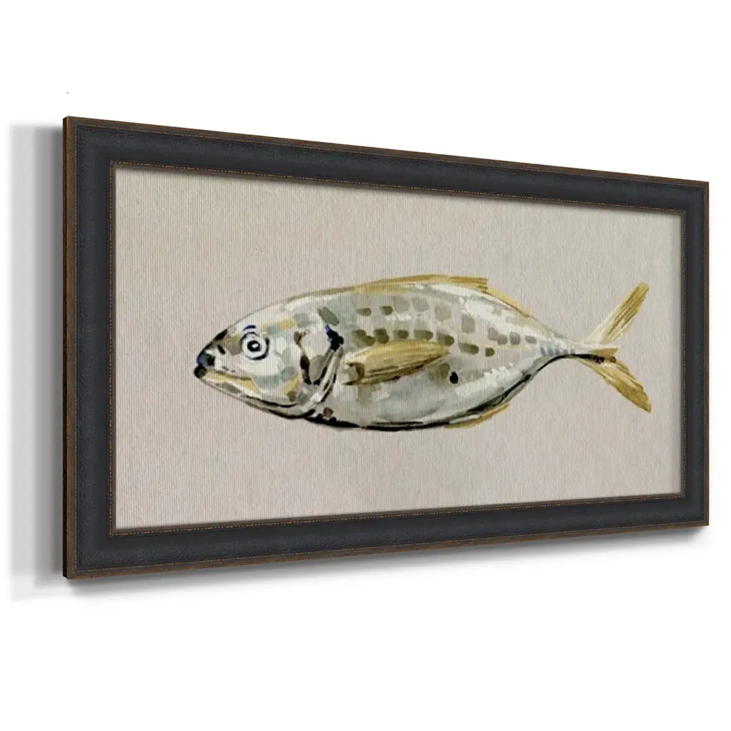 Fresh Fish Study II Premium Framed Canvas- Ready to Hang A Premium Framed Canvas created to last. Framed in distressed wood and available in an array of sizes and colors Featuring a beveled a solid wood stretcher bar, each piece comes ready to hand 3 SIZES AVAILABLE 21''X37'' - Overall Size 25''X45'' - Overall Size 29''x53'' - Overall Size Each piece is made to order. Each piece comes with hanging hardware. Made in the USA Ready to Hang Giclee Paper Print Acrylic Glass Beveled Matt Board