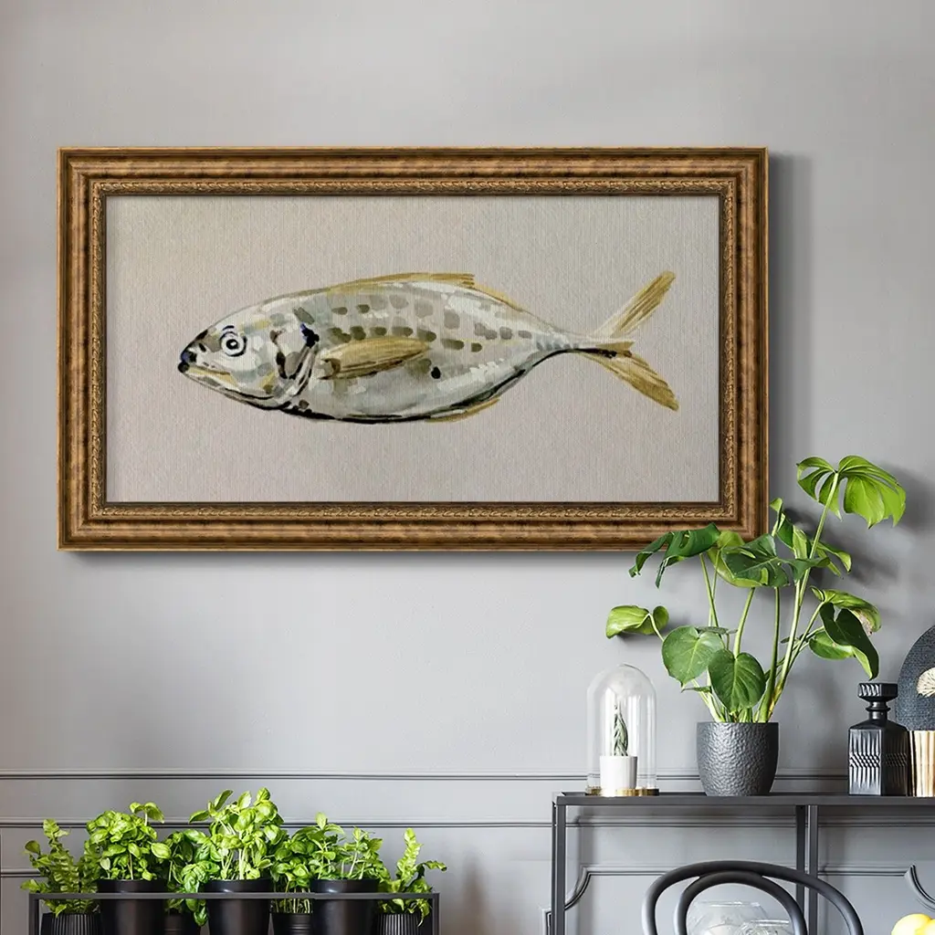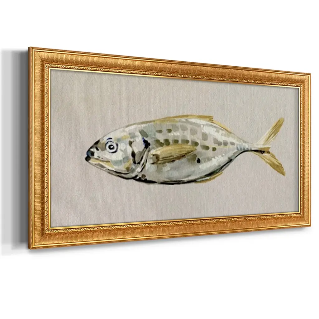 Fresh Fish Study II Premium Framed Canvas- Ready to Hang A Premium Framed Canvas created to last. Framed in distressed wood and available in an array of sizes and colors Featuring a beveled a solid wood stretcher bar, each piece comes ready to hand 3 SIZES AVAILABLE 21''X37'' - Overall Size 25''X45'' - Overall Size 29''x53'' - Overall Size Each piece is made to order. Each piece comes with hanging hardware. Made in the USA Ready to Hang Giclee Paper Print Acrylic Glass Beveled Matt Board