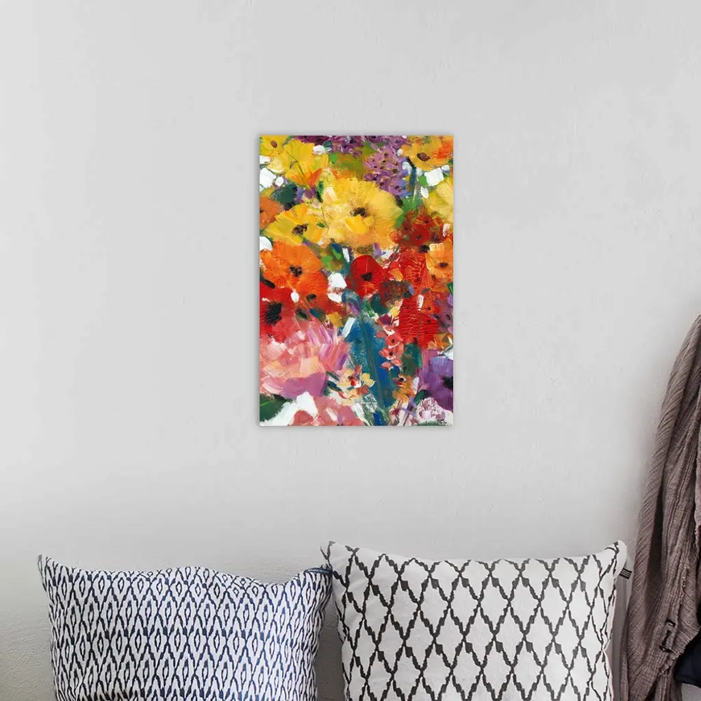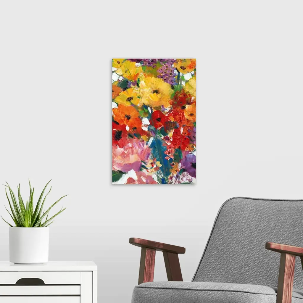Contemporary artwork of a rainbow colored bouquet of flowers.
