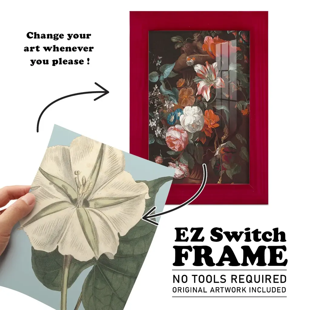 Fresh Florals IV -EZ SWITCH Framed Print w/glass-Cherry Red A delightful, framed print. Featuring a solid wood frame with real wood glass. This premium print is giclee quality. In addition, every frame features a removable back and table top stand. This allows you to change your art in the future or to just stand the art on a table for a new look. We are sure you'll enjoy our new series of EZ SWITCH Framed Art. Solid Wood Frame Real Glass Removable / Replaceable Art Built in Tabletop Stand Sizes range from 4x6 up to 12x15 - buy just one or pair them up as sets as you see fit.