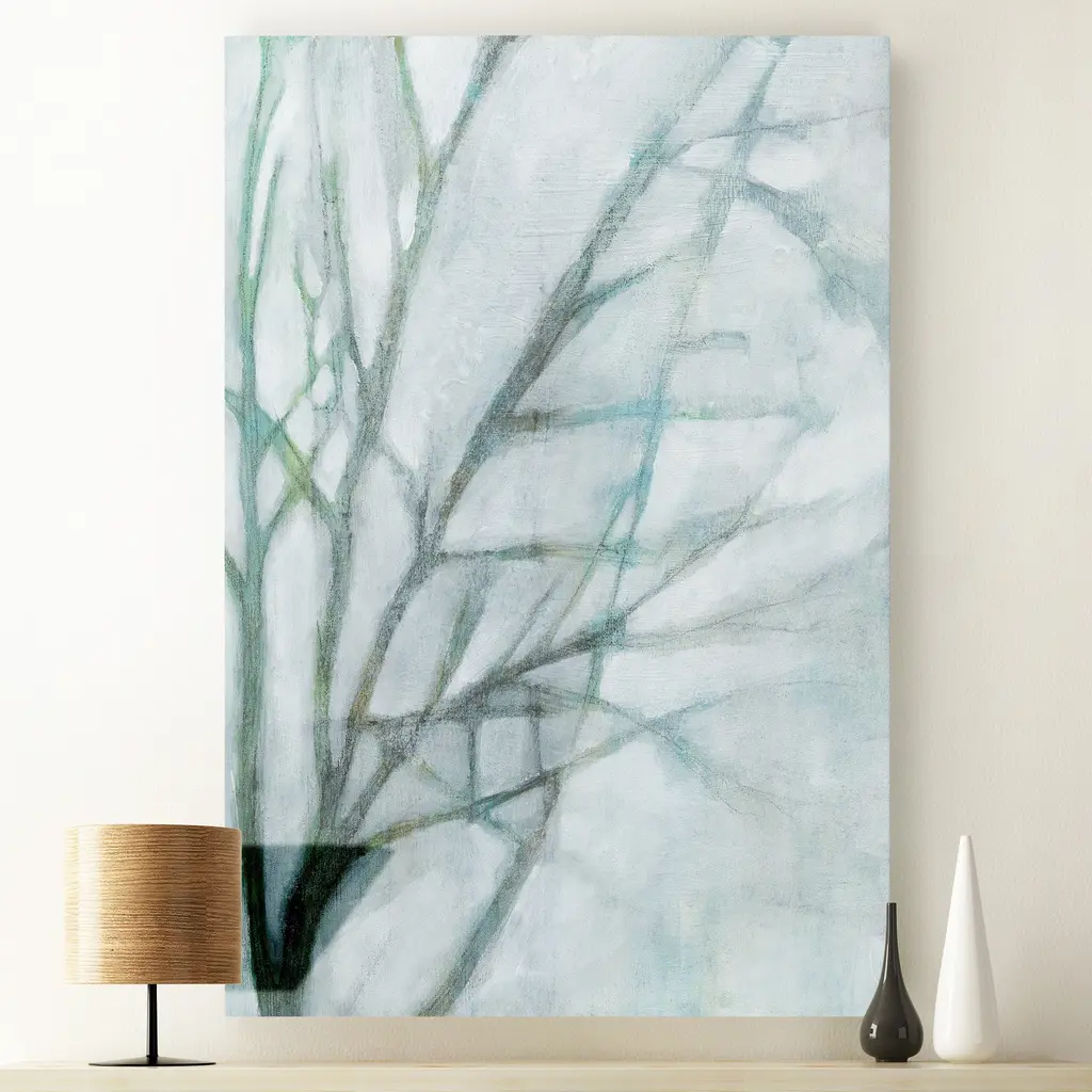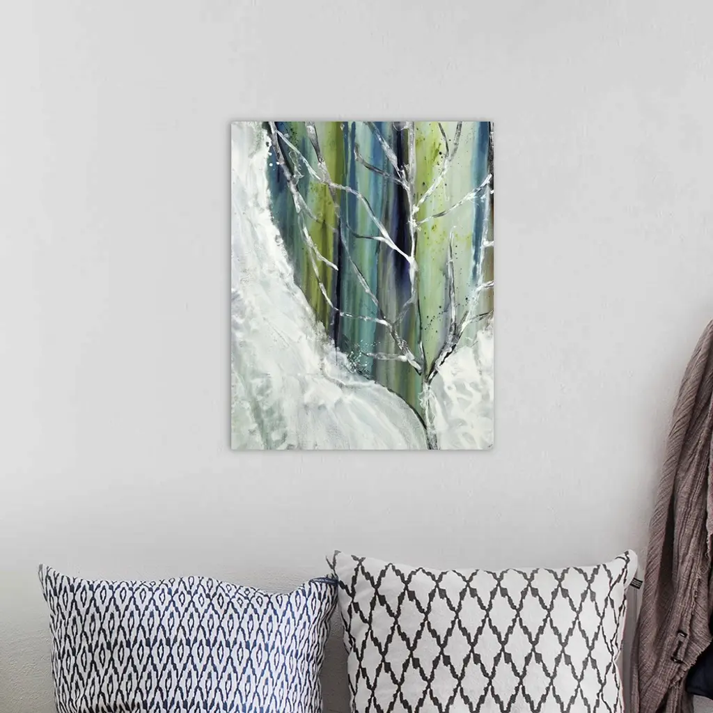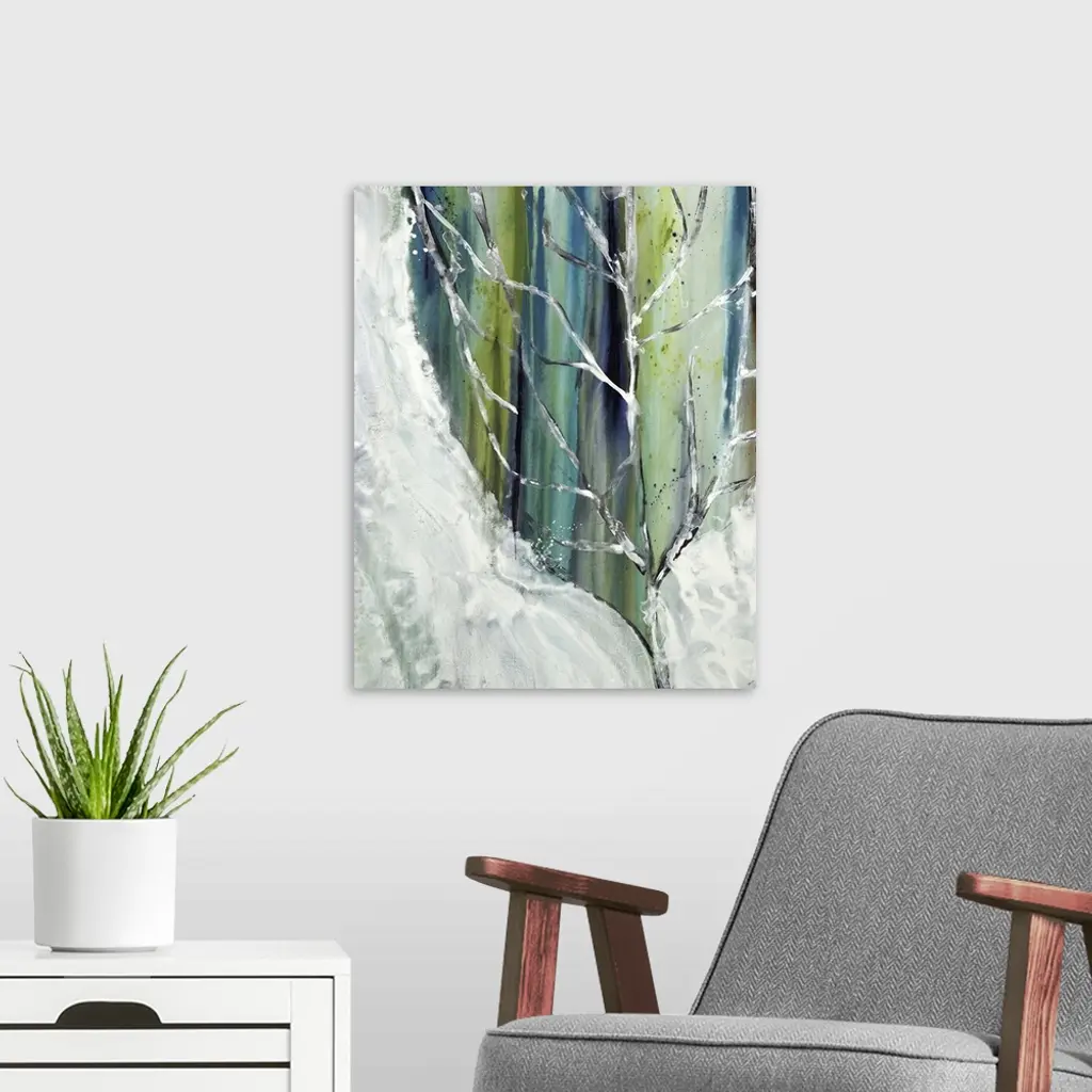 Abstract painting with a frozen tree branch in the foreground with white sides and a green, brown, and blue streaked background.