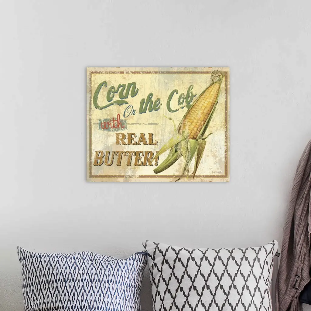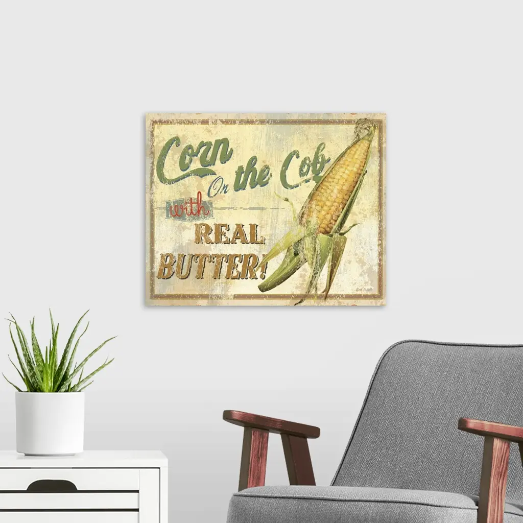 Contemporary artwork of a vintage looking sign with corn to the right of the image and text to the left.