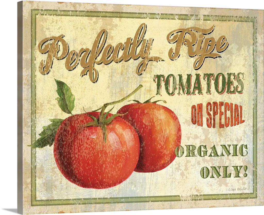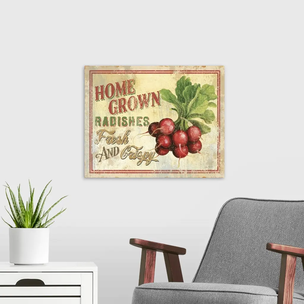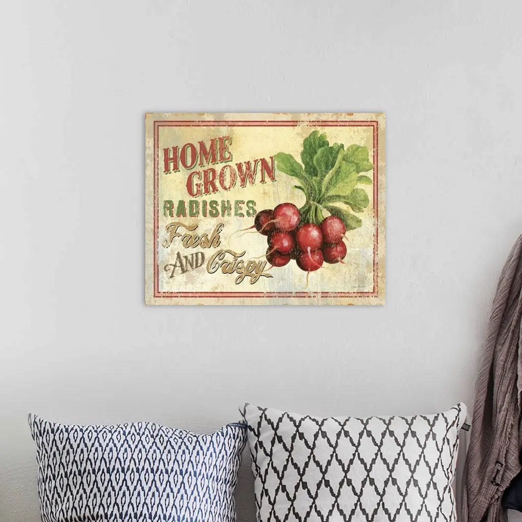 Contemporary artwork of a vintage looking sign with radishes to the right of the image and text to the left.