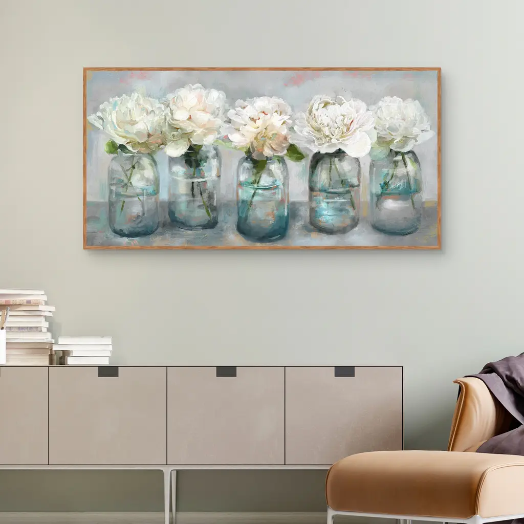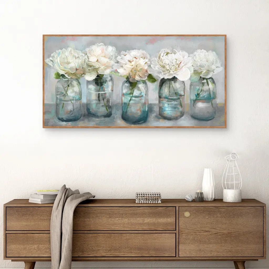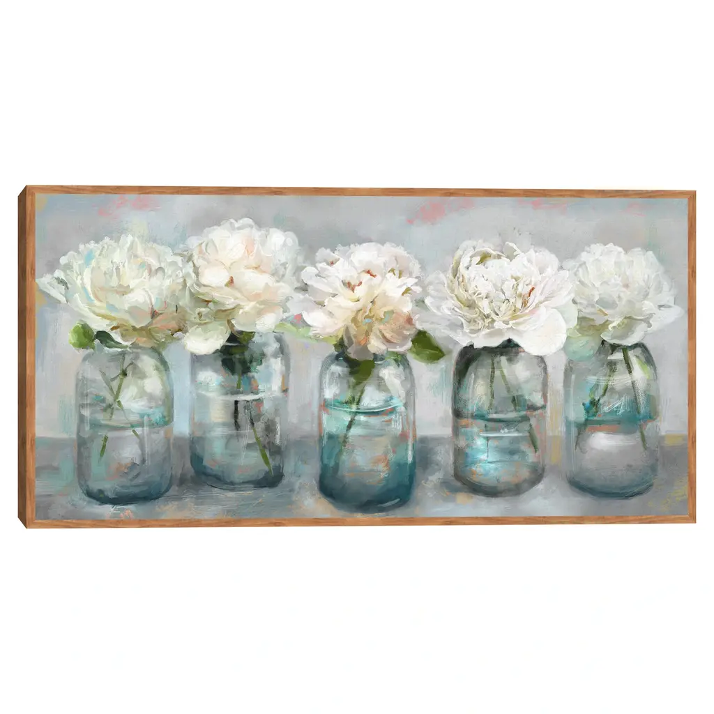 Five mason jars line up neatly in a row, each complete with its own chiffon-like bloom and painted in dreamy blue and gray tones and tinged with pink in this effortlessly elegant canvas print by Studio Arts. Produced with full-bleed printing that covers the entirety of the canvas, your new masterpiece is made with state-of-the-art technology for that museum-quality look. Plus, your new masterpiece comes ready to hang and is surrounded by a stylish, hand-crafted frame that enhances the beauty of your new artwork.