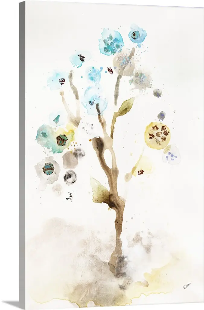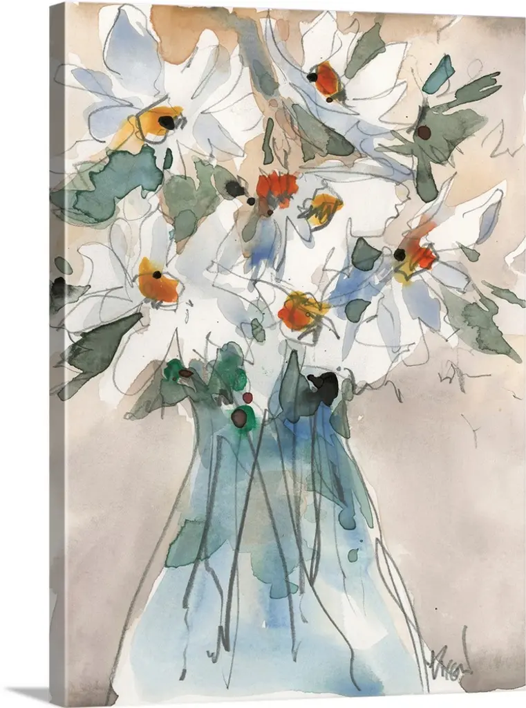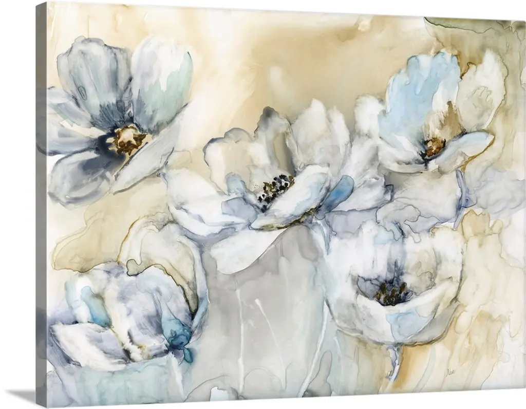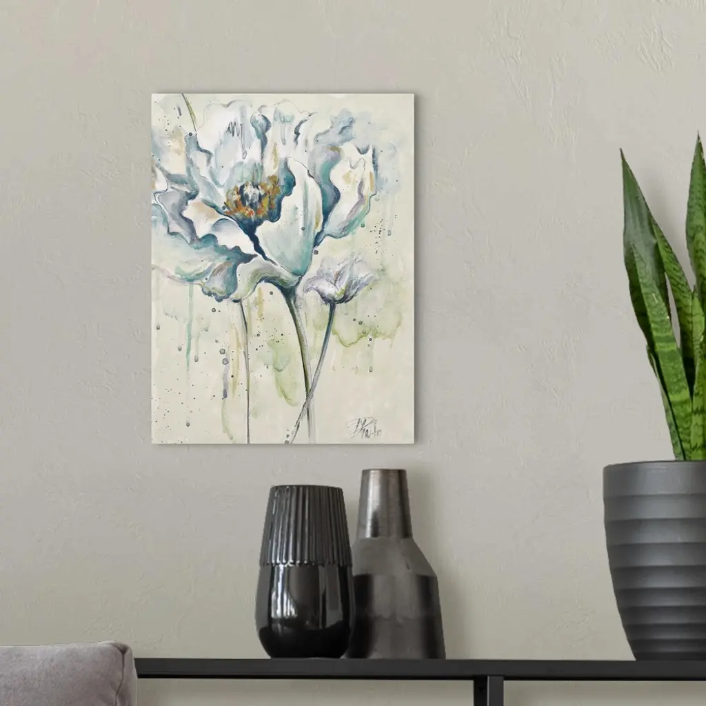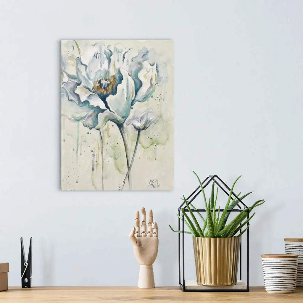 Contemporary painting of white poppy flowers against a watercolor splattered background.