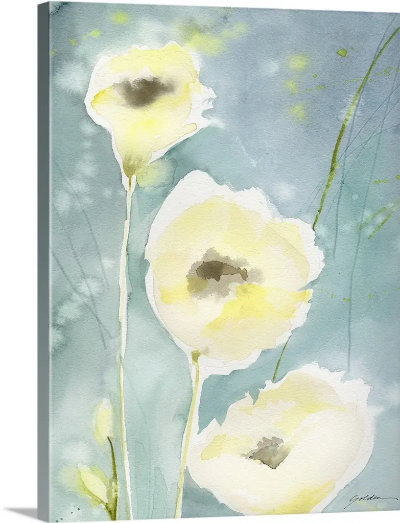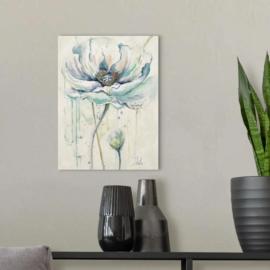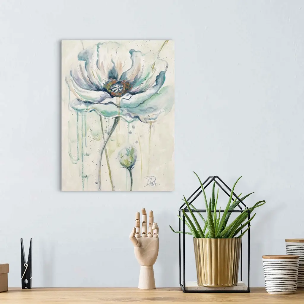 Contemporary painting of white poppy flowers against a watercolor splattered background.