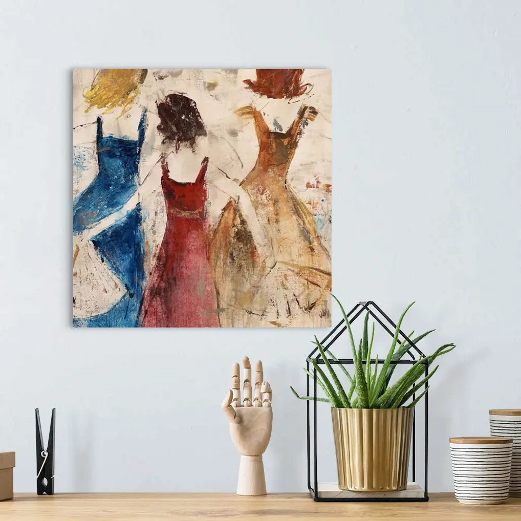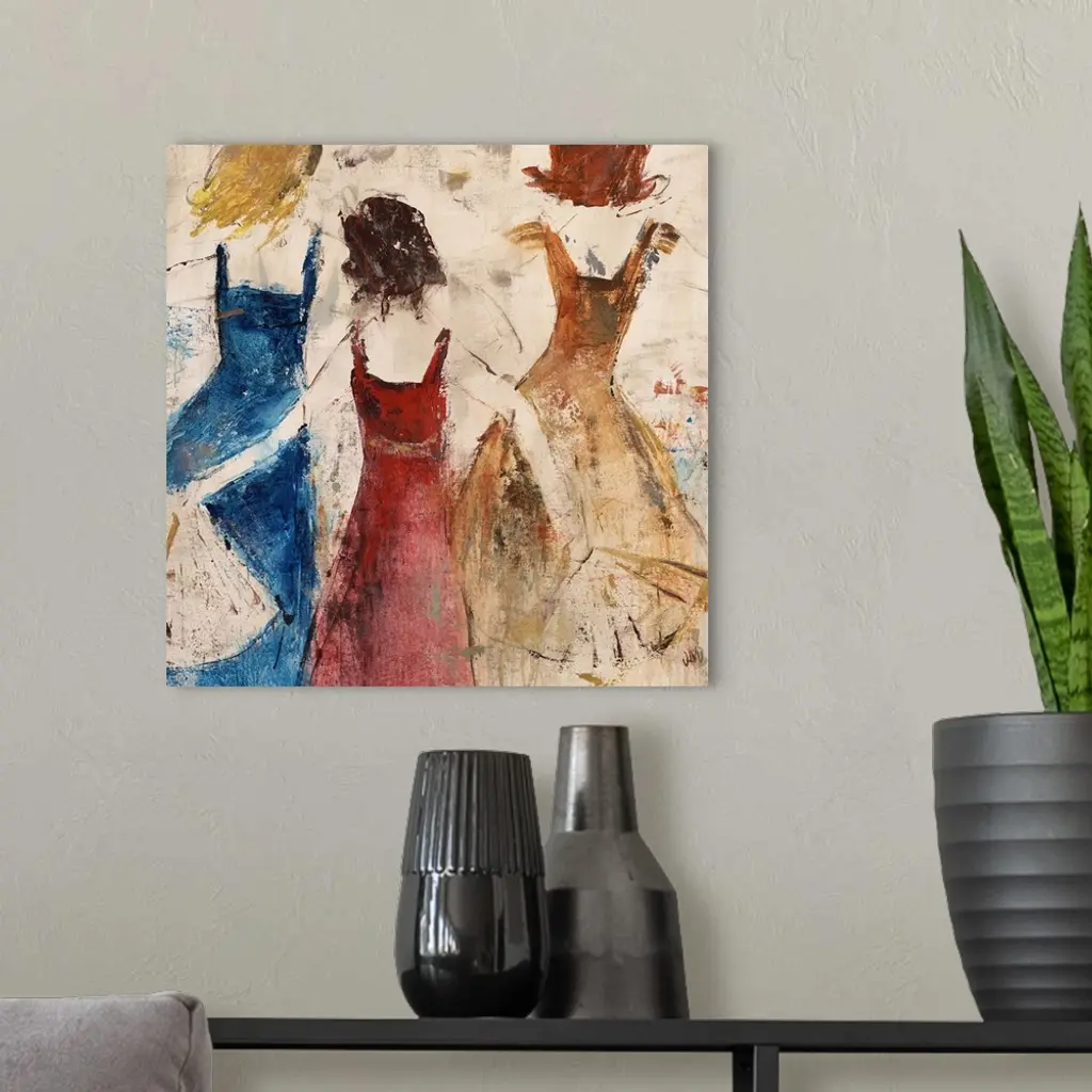 Contemporary painting of three women in colorful dresses with backs facing viewer.