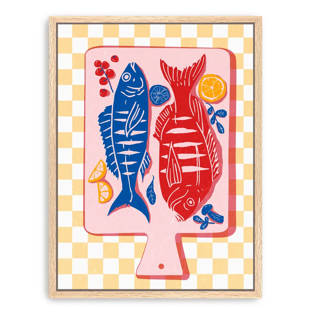 This vibrant canvas print captures the joy of cooking with a bold illustration of fish, lemons, and fresh herbs in a retro-inspired palette. Perfect for kitchens and dining areas, it brings a fun, foodie vibe to your decor. Our Gallery Wrap Canvas Prints are proudly assembled with high quality materials in California, USA. Each piece is printed on a thick, archival grade canvas using Giclee technology. It is then hand-stretched by our experienced artisans over solid wood bars, which will not warp over time. The final product is a piece personally crafted for you to confidently display on your wall. Care and Assembly: Ensure that the location of your piece has little to no exposure to heat, sunlight, and moisture. Wipe clean, only if needed. Each piece includes hanging hardware to hang on your wall vertically.