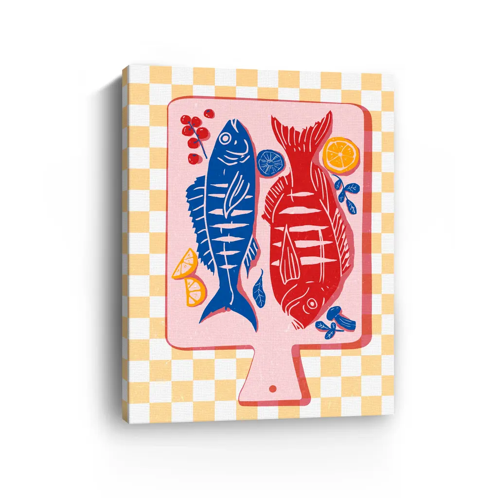 This vibrant canvas print captures the joy of cooking with a bold illustration of fish, lemons, and fresh herbs in a retro-inspired palette. Perfect for kitchens and dining areas, it brings a fun, foodie vibe to your decor. Our Gallery Wrap Canvas Prints are proudly assembled with high quality materials in California, USA. Each piece is printed on a thick, archival grade canvas using Giclee technology. It is then hand-stretched by our experienced artisans over solid wood bars, which will not warp over time. The final product is a piece personally crafted for you to confidently display on your wall. Care and Assembly: Ensure that the location of your piece has little to no exposure to heat, sunlight, and moisture. Wipe clean, only if needed. Each piece includes hanging hardware to hang on your wall vertically.