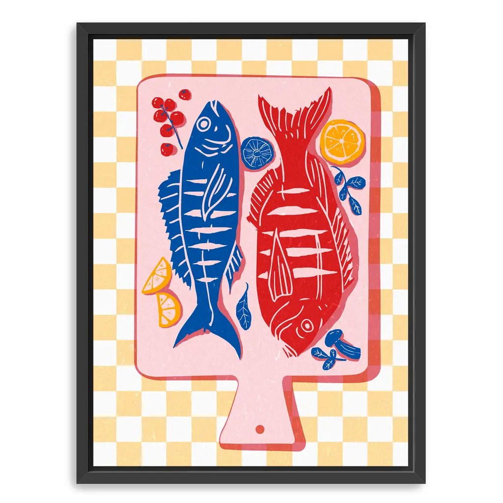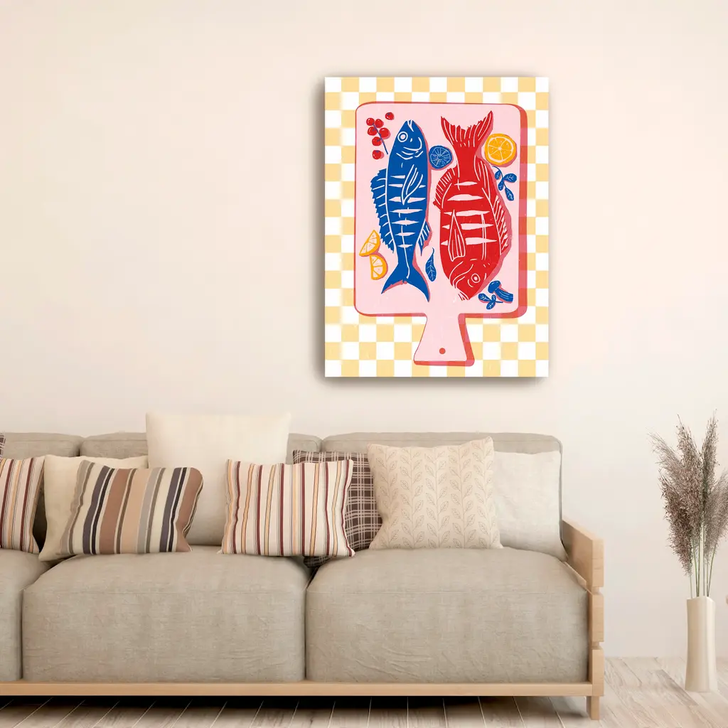 This vibrant canvas print captures the joy of cooking with a bold illustration of fish, lemons, and fresh herbs in a retro-inspired palette. Perfect for kitchens and dining areas, it brings a fun, foodie vibe to your decor. Our Gallery Wrap Canvas Prints are proudly assembled with high quality materials in California, USA. Each piece is printed on a thick, archival grade canvas using Giclee technology. It is then hand-stretched by our experienced artisans over solid wood bars, which will not warp over time. The final product is a piece personally crafted for you to confidently display on your wall. Care and Assembly: Ensure that the location of your piece has little to no exposure to heat, sunlight, and moisture. Wipe clean, only if needed. Each piece includes hanging hardware to hang on your wall vertically.