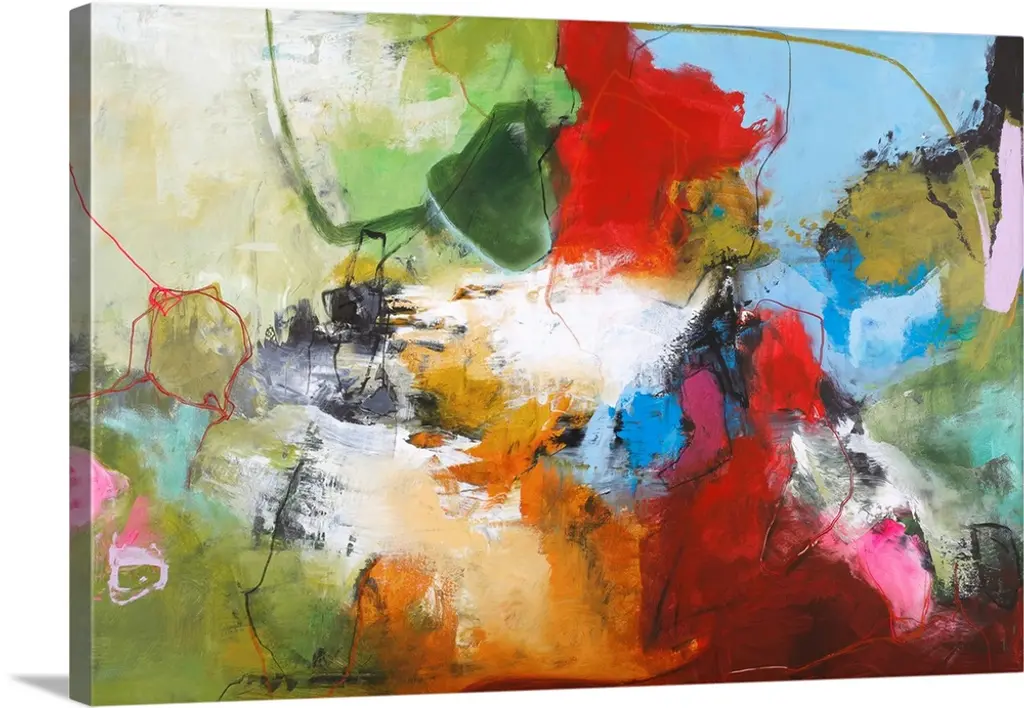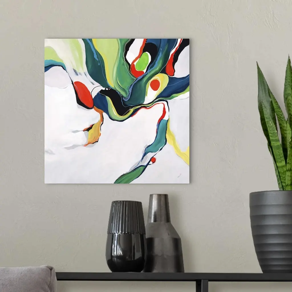 Contemporary abstract painting using tones of green and red in organic globular forms against a neutral background.