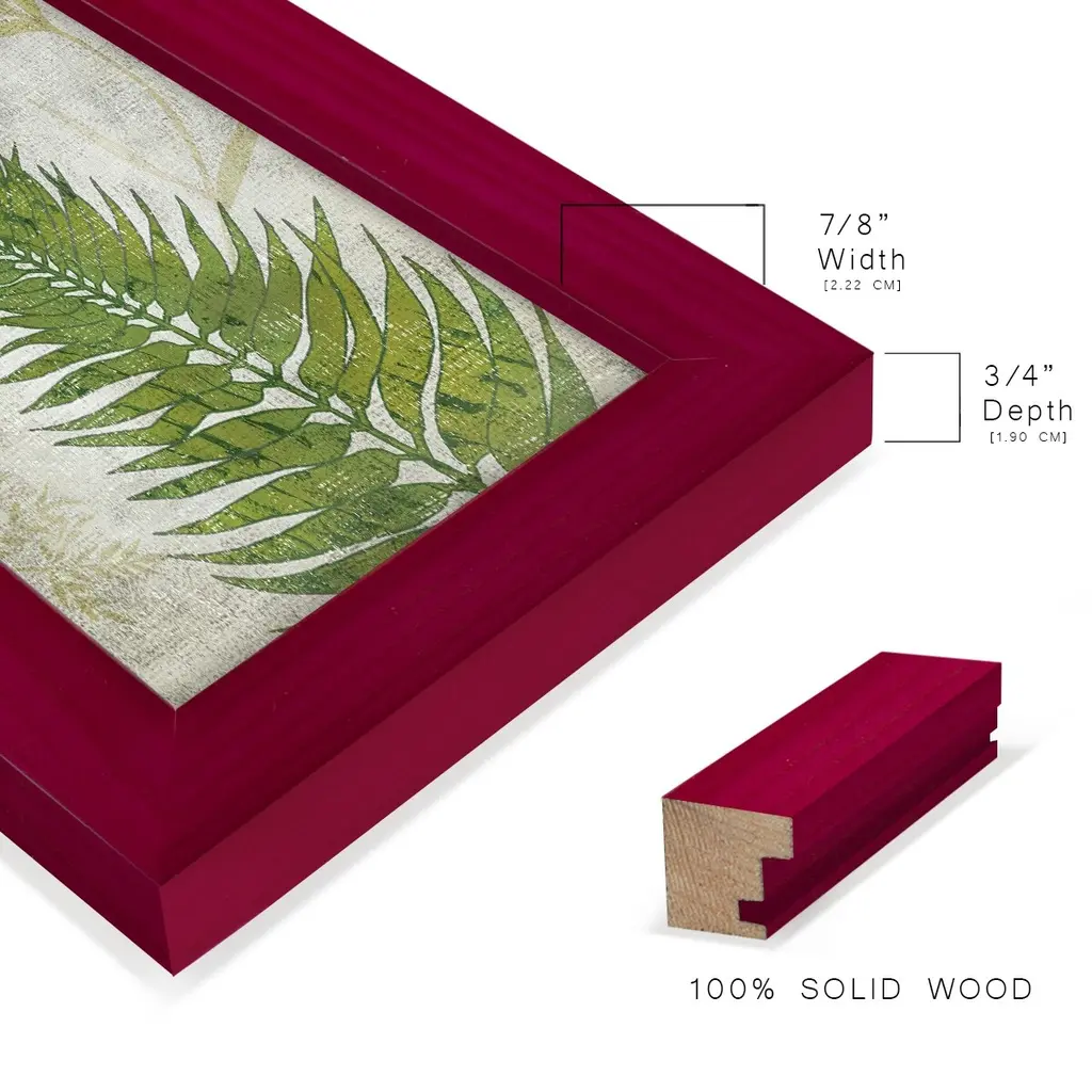 Frond II -EZ SWITCH Framed Print w/glass-Cherry Red A delightful, framed print. Featuring a solid wood frame with real wood glass. This premium print is giclee quality. In addition, every frame features a removable back and table top stand. This allows you to change your art in the future or to just stand the art on a table for a new look. We are sure you'll enjoy our new series of EZ SWITCH Framed Art. Solid Wood Frame Real Glass Removable / Replaceable Art Built in Tabletop Stand Sizes range from 4x6 up to 12x15 - buy just one or pair them up as sets as you see fit.