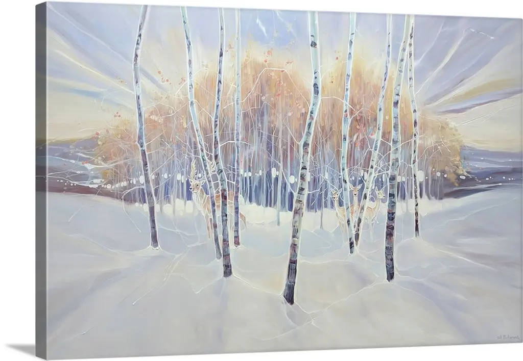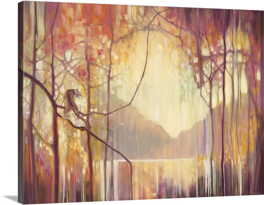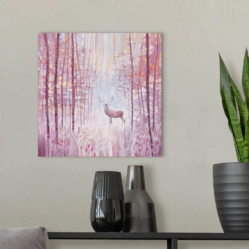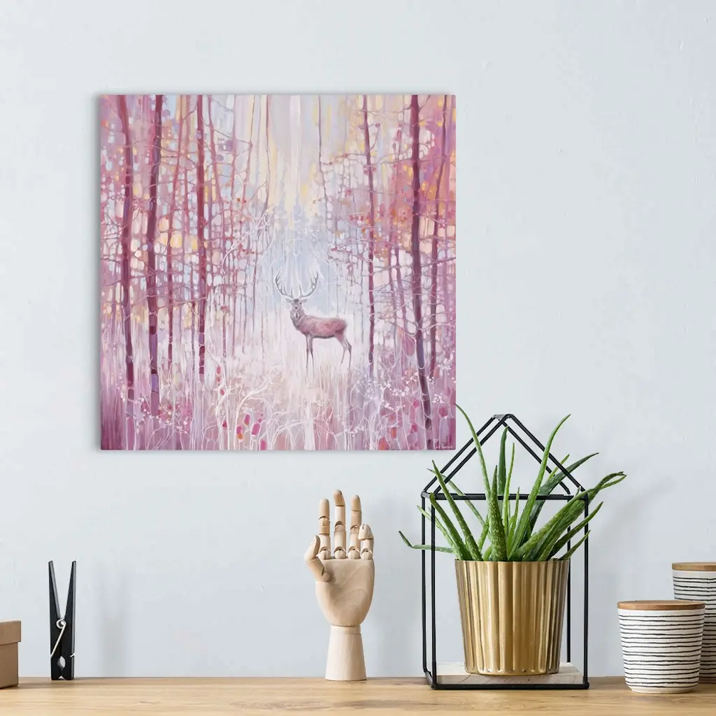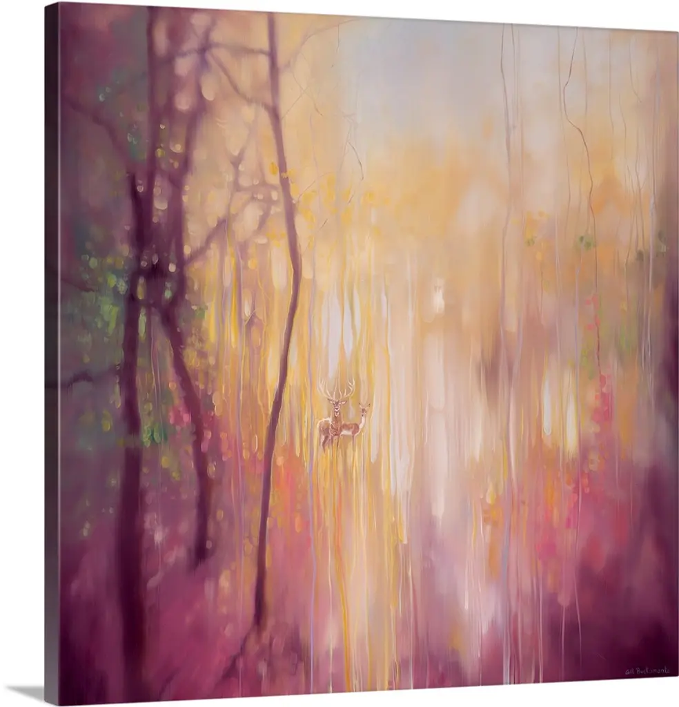Watercolor painting of a deer, deep within a colorful, dream-like forest.