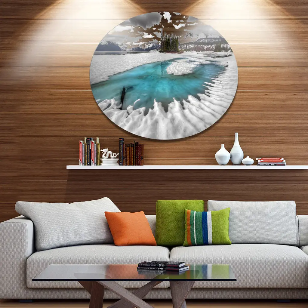 Bring Contemporary Abstraction to your home with this large Circle Metal wall art. This Frosted Crystal Clear Lake Metal Artwork makes it the focal point of any room or office. - White Gloss Coating ensures colors are extra vibrant with light reflection.- Aluminum grade Sheet Metal with 1 inch mounting frame on the back giving the illusion that the artwork is floating on the wall..- Mounting Brackets are included along with instructions.- High Quality Digital images are created directly into a glossy aluminum panel producing a stunning and captivating print into the glossy finish of the metal.- Water, Fire and Scratch resistant HD Aluminum panels.- Looks better than any photo paper and guaranteed to last at least 20 years- Easy to clean with a microfiber cloth. Colors are far superior to regular Canvas Art. - Easy to Hang
