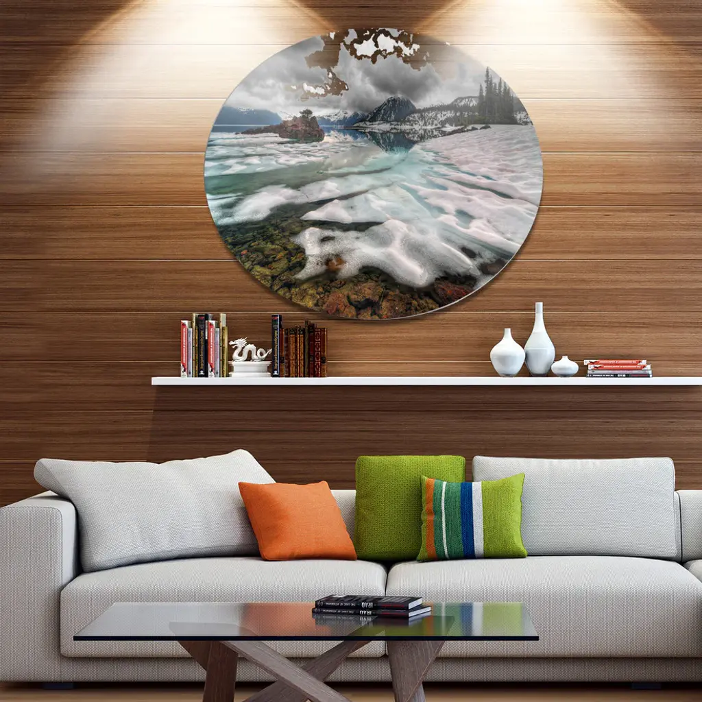 Bring Contemporary Abstraction to your home with this large Circle Metal wall art. This Frozen Mountain Lake Shore Metal Artwork makes it the focal point of any room or office. - White Gloss Coating ensures colors are extra vibrant with light reflection.- Aluminum grade Sheet Metal with 1 inch mounting frame on the back giving the illusion that the artwork is floating on the wall..- Mounting Brackets are included along with instructions.- High Quality Digital images are created directly into a glossy aluminum panel producing a stunning and captivating print into the glossy finish of the metal.- Water, Fire and Scratch resistant HD Aluminum panels.- Looks better than any photo paper and guaranteed to last at least 20 years- Easy to clean with a microfiber cloth. Colors are far superior to regular Canvas Art. - Easy to Hang