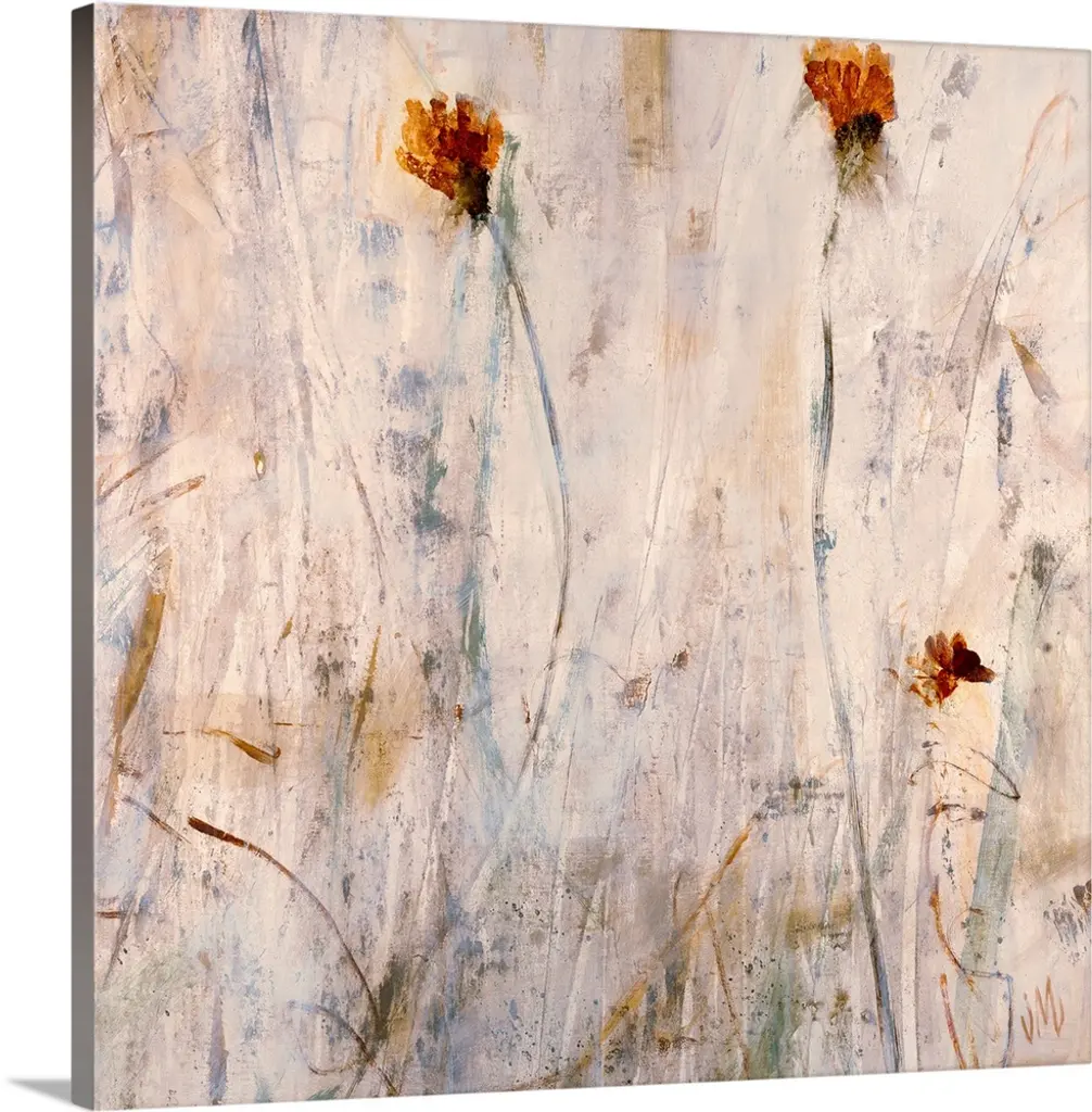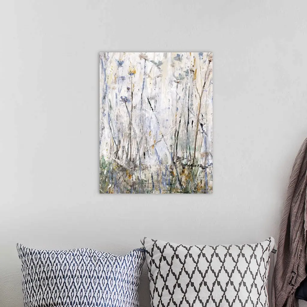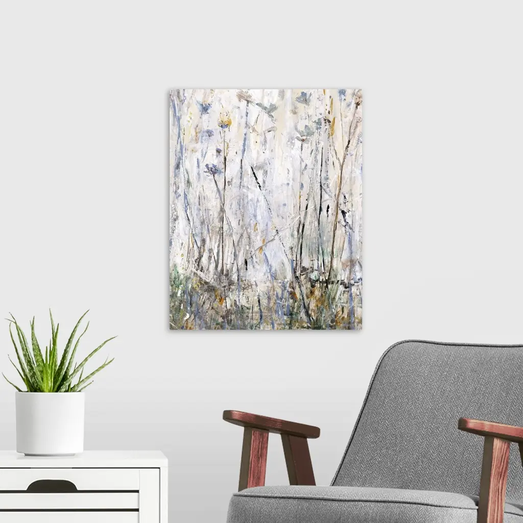 Contemporary abstract painting with long, thin, brown, blue, emerald green, and gold brushstrokes and a cluster of color at the bottom on a white, gray, and beige background.