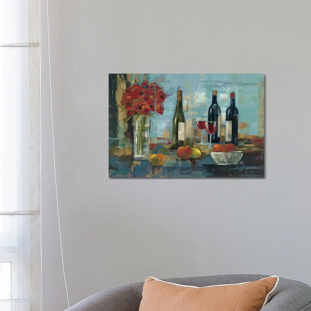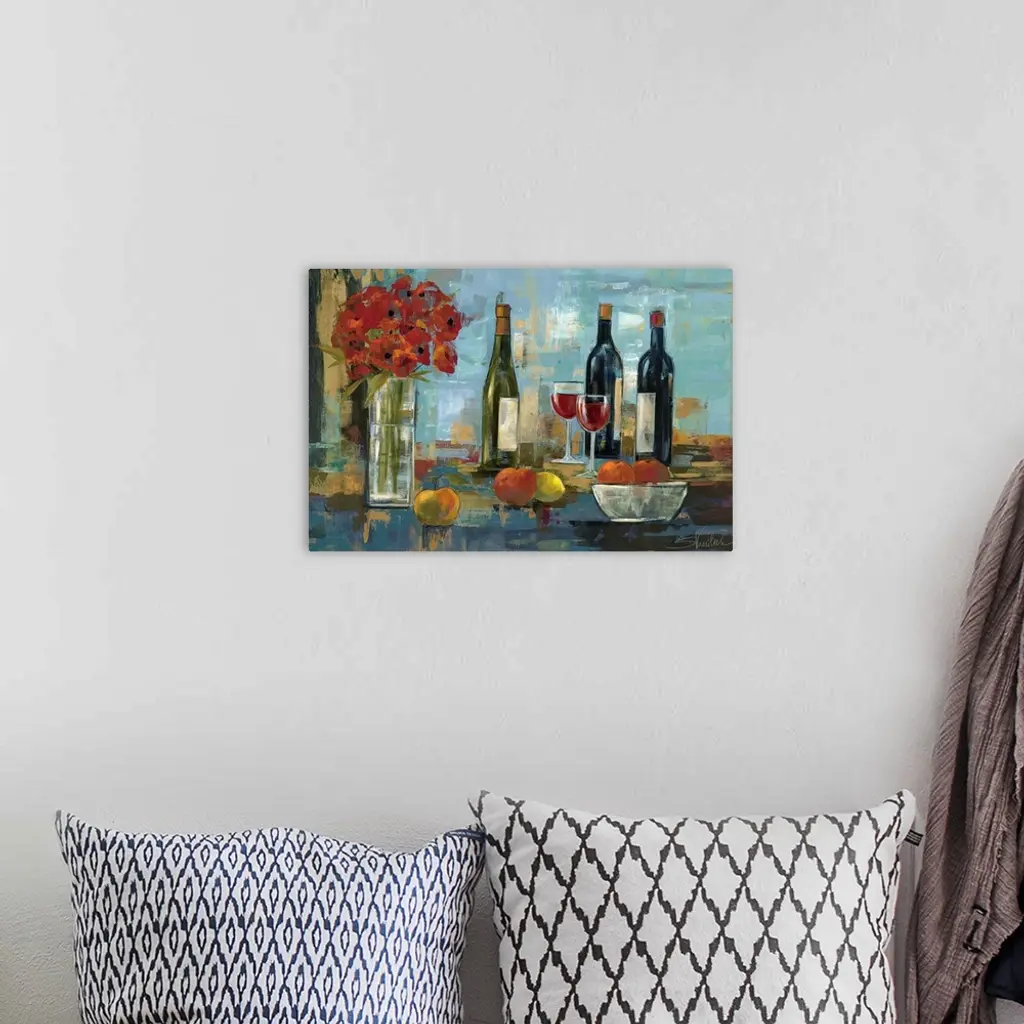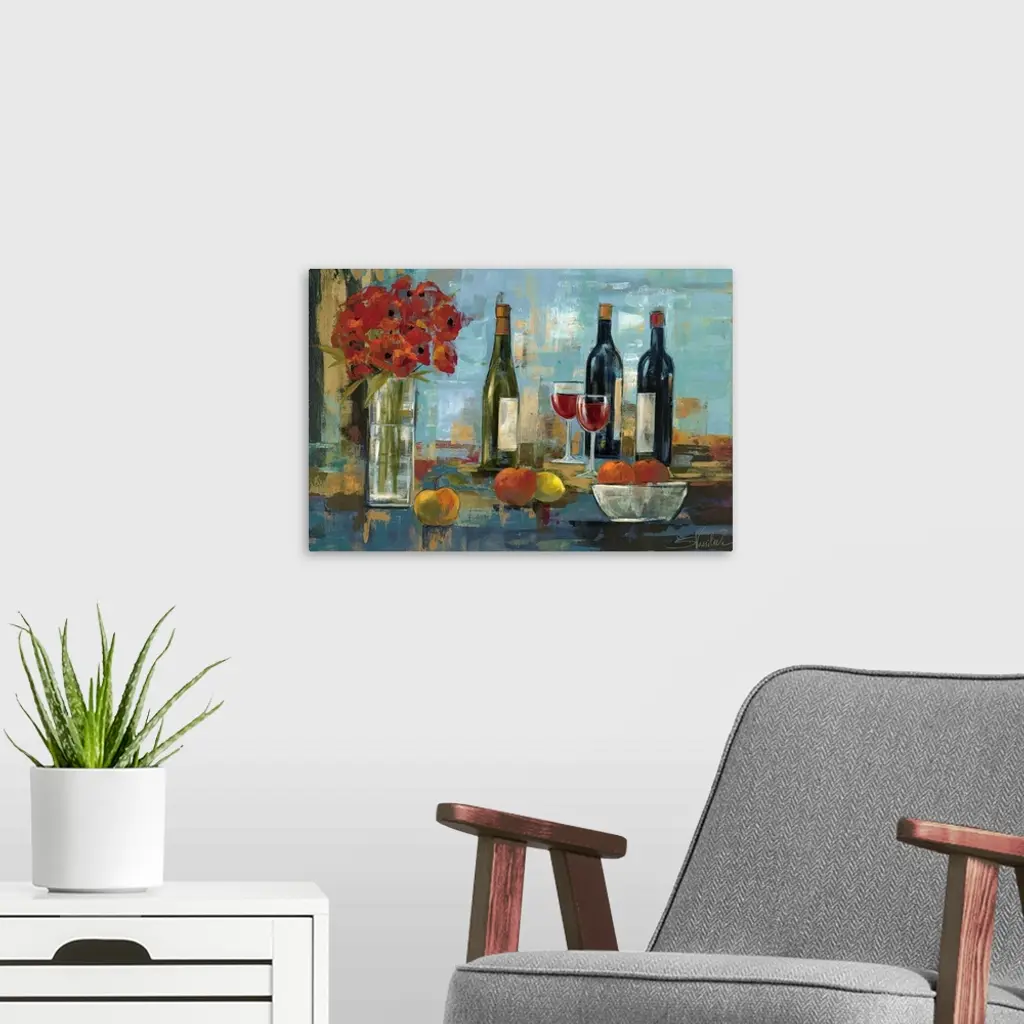 Horizontal painting of several wine bottles sitting next to a vase of red flowers, with two wine glasses and various fruits in the foreground, on a large canvas.