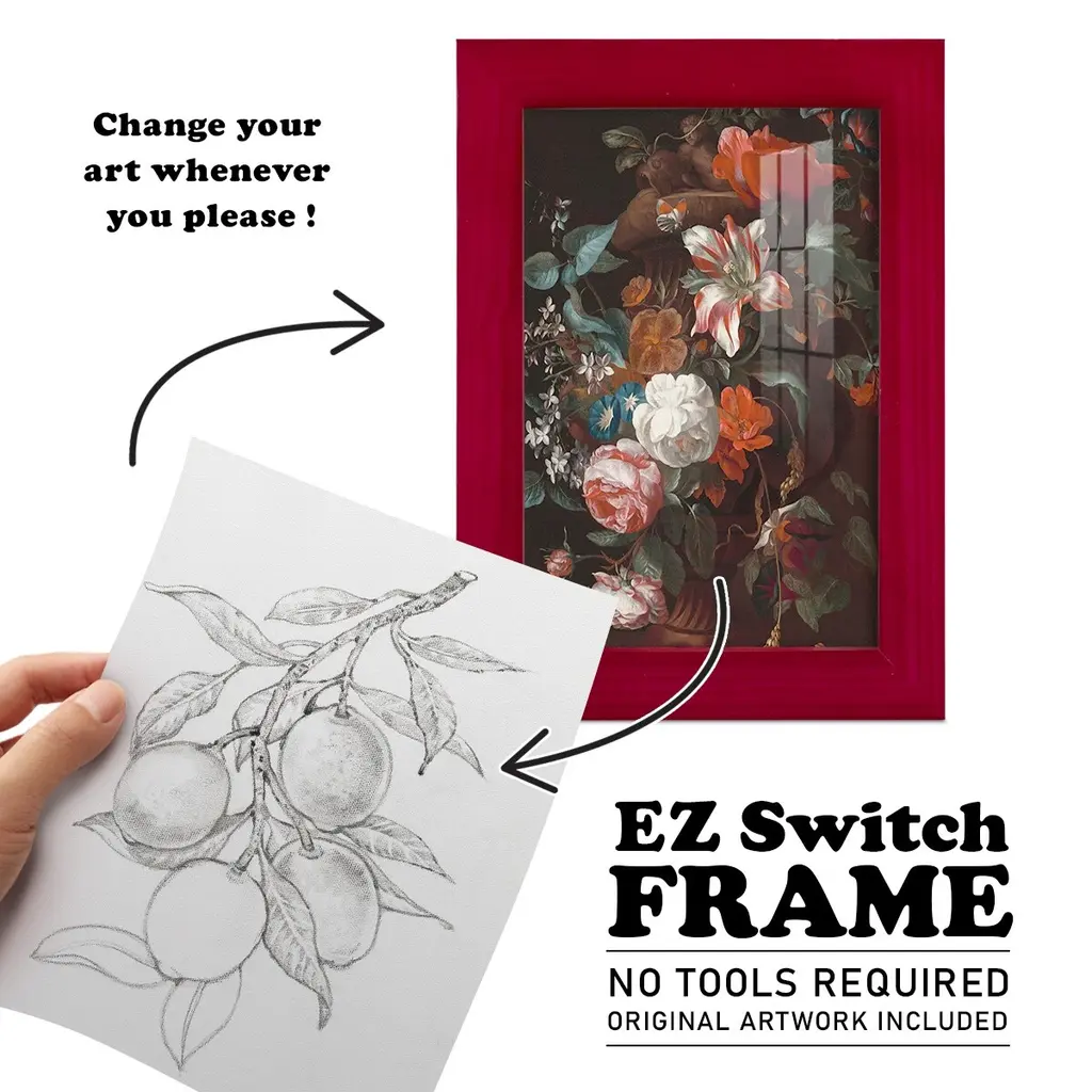 FruitBearing Branch I -EZ SWITCH Framed Print w/glass-Cherry Red A delightful, framed print. Featuring a solid wood frame with real wood glass. This premium print is giclee quality. In addition, every frame features a removable back and table top stand. This allows you to change your art in the future or to just stand the art on a table for a new look. We are sure you'll enjoy our new series of EZ SWITCH Framed Art. Solid Wood Frame Real Glass Removable / Replaceable Art Built in Tabletop Stand Sizes range from 4x6 up to 12x15 - buy just one or pair them up as sets as you see fit.