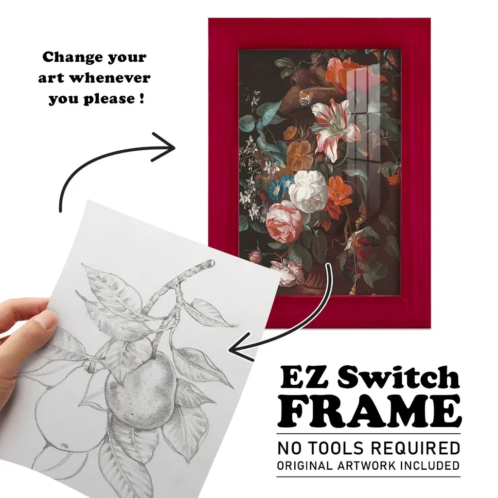 FruitBearing Branch III -EZ SWITCH Framed Print w/glass-Cherry Red A delightful, framed print. Featuring a solid wood frame with real wood glass. This premium print is giclee quality. In addition, every frame features a removable back and table top stand. This allows you to change your art in the future or to just stand the art on a table for a new look. We are sure you'll enjoy our new series of EZ SWITCH Framed Art. Solid Wood Frame Real Glass Removable / Replaceable Art Built in Tabletop Stand Sizes range from 4x6 up to 12x15 - buy just one or pair them up as sets as you see fit.