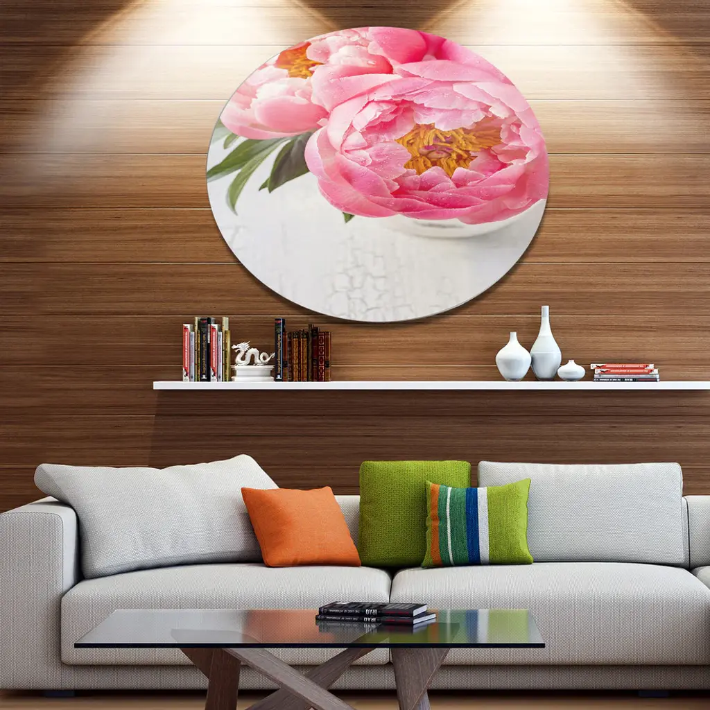 Bring Contemporary Abstraction to your home with this large Circle Metal wall art. This Full Bloom Pink Peony Flowers Metal Artwork makes it the focal point of any room or office. - White Gloss Coating ensures colors are extra vibrant with light reflection.- Aluminum grade Sheet Metal with 1 inch mounting frame on the back giving the illusion that the artwork is floating on the wall..- Mounting Brackets are included along with instructions.- High Quality Digital images are created directly into a glossy aluminum panel producing a stunning and captivating print into the glossy finish of the metal.- Water, Fire and Scratch resistant HD Aluminum panels.- Looks better than any photo paper and guaranteed to last at least 20 years- Easy to clean with a microfiber cloth. Colors are far superior to regular Canvas Art. - Easy to Hang