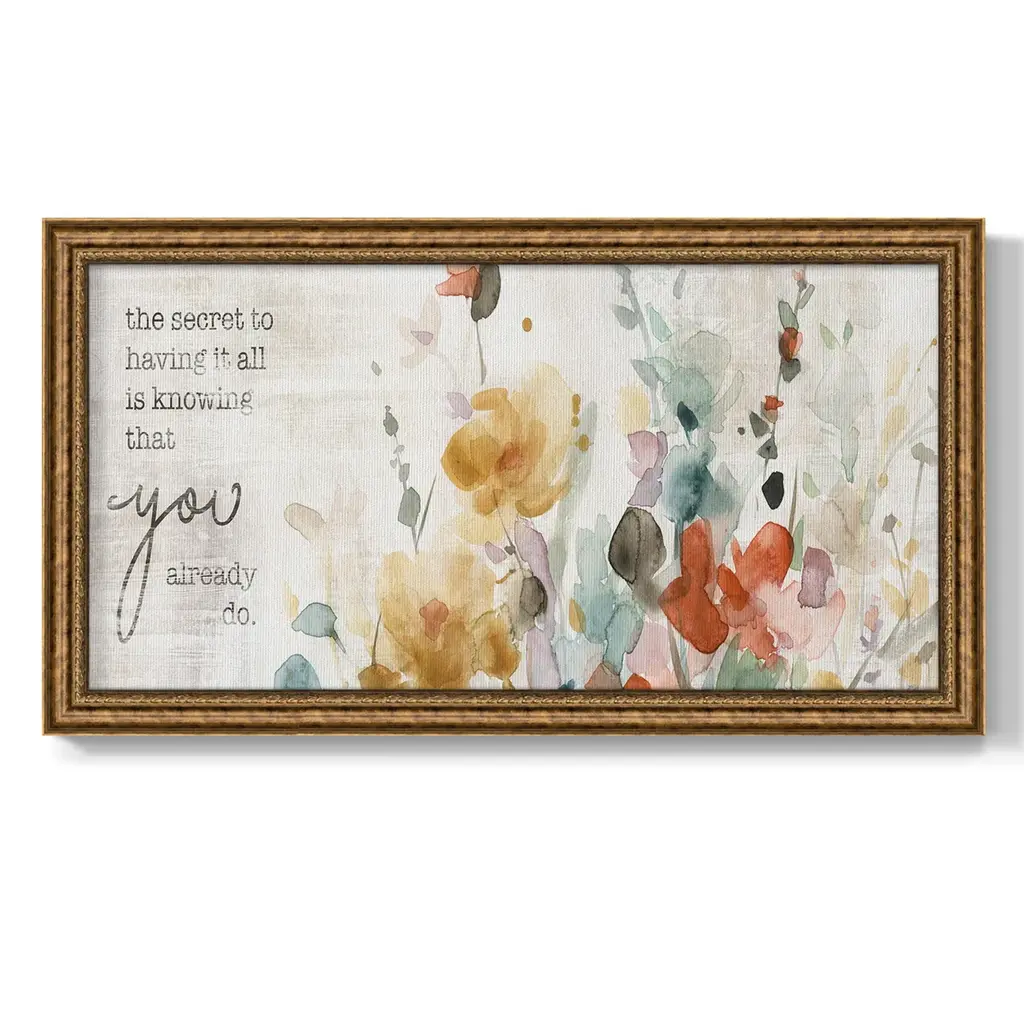 Full Bloom Verse Premium Framed Canvas- Ready to Hang A Premium Framed Canvas created to last. Framed in distressed wood and available in an array of sizes and colors Featuring a beveled a solid wood stretcher bar, each piece comes ready to hand 3 SIZES AVAILABLE 21''X37'' - Overall Size 25''X45'' - Overall Size 29''x53'' - Overall Size Each piece is made to order. Each piece comes with hanging hardware. Made in the USA Ready to Hang Giclee Paper Print Acrylic Glass Beveled Matt Board