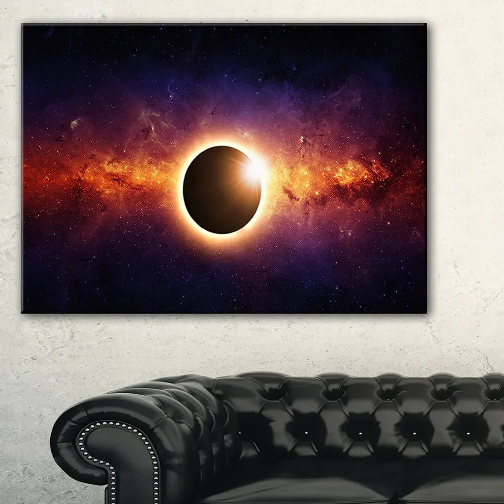 The Full Eclipse View canvas art print is sure to make an impression on anyone who sees it. This artwork is gallery wrapped around a 1-inch solid wood frame and arrives carefully packaged and entirely ready to hang on the wall. Design Art only uses the highest resolution and pigments to ensure a crisp colorful print that is never faded or pixelated. This artwork is sure to be a conversation starter in any home or office.