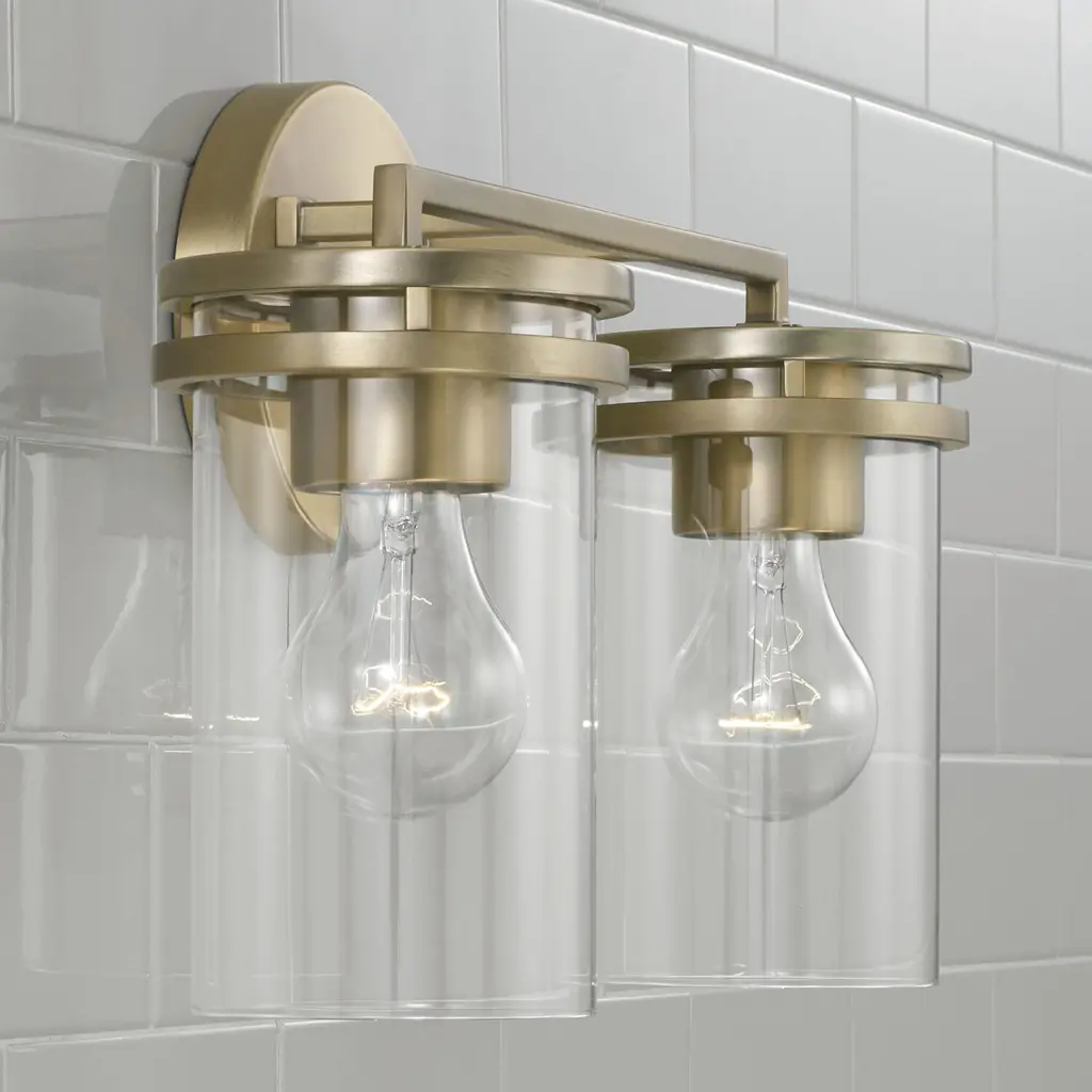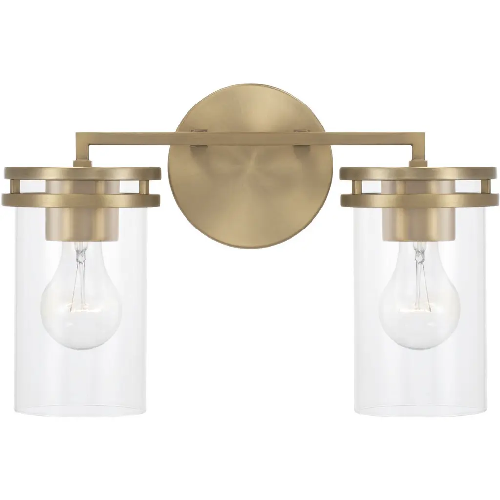 The contemporary form and clear glass create sleek style with the Fuller 2-Light Vanity for HomePlace. The Aged Brass finish brings mid-century sophistication to any space. Also available in a 3-Light or 4-Light.