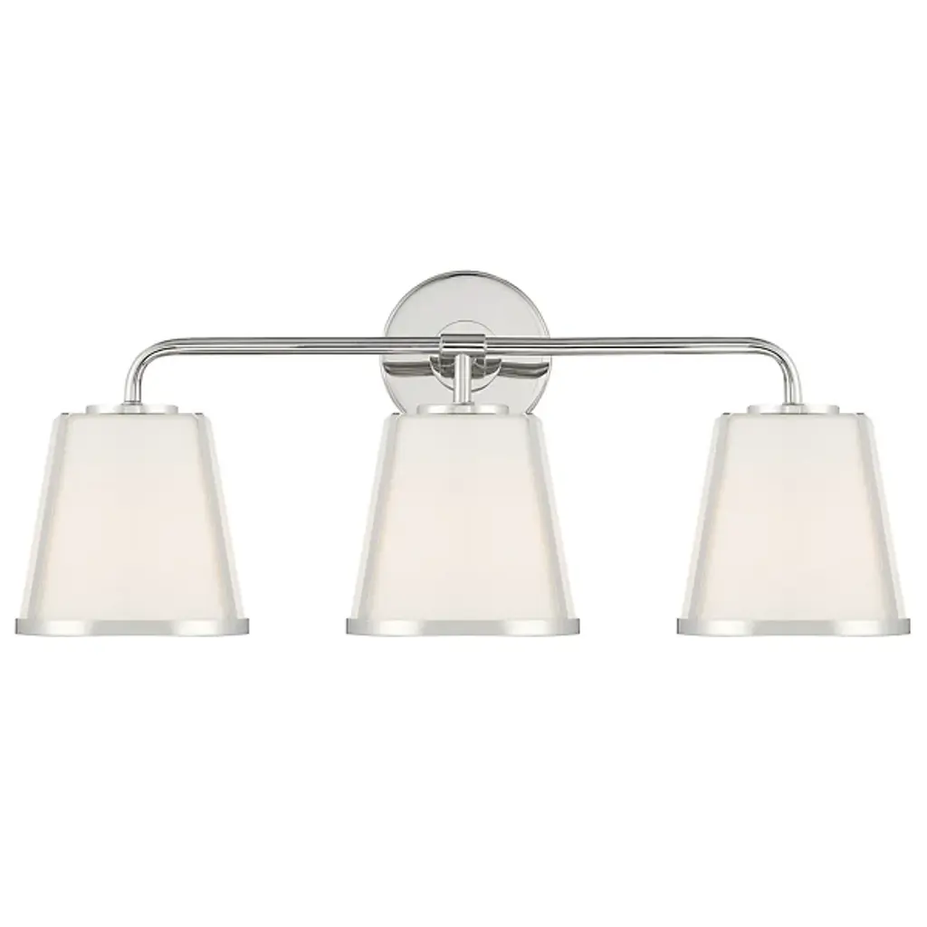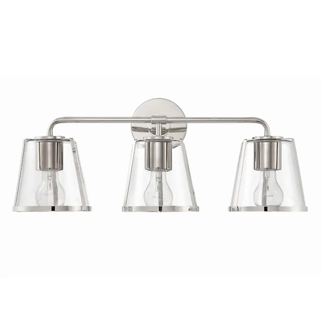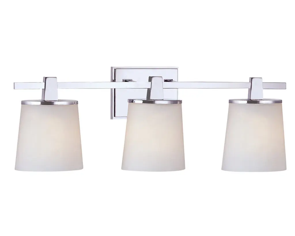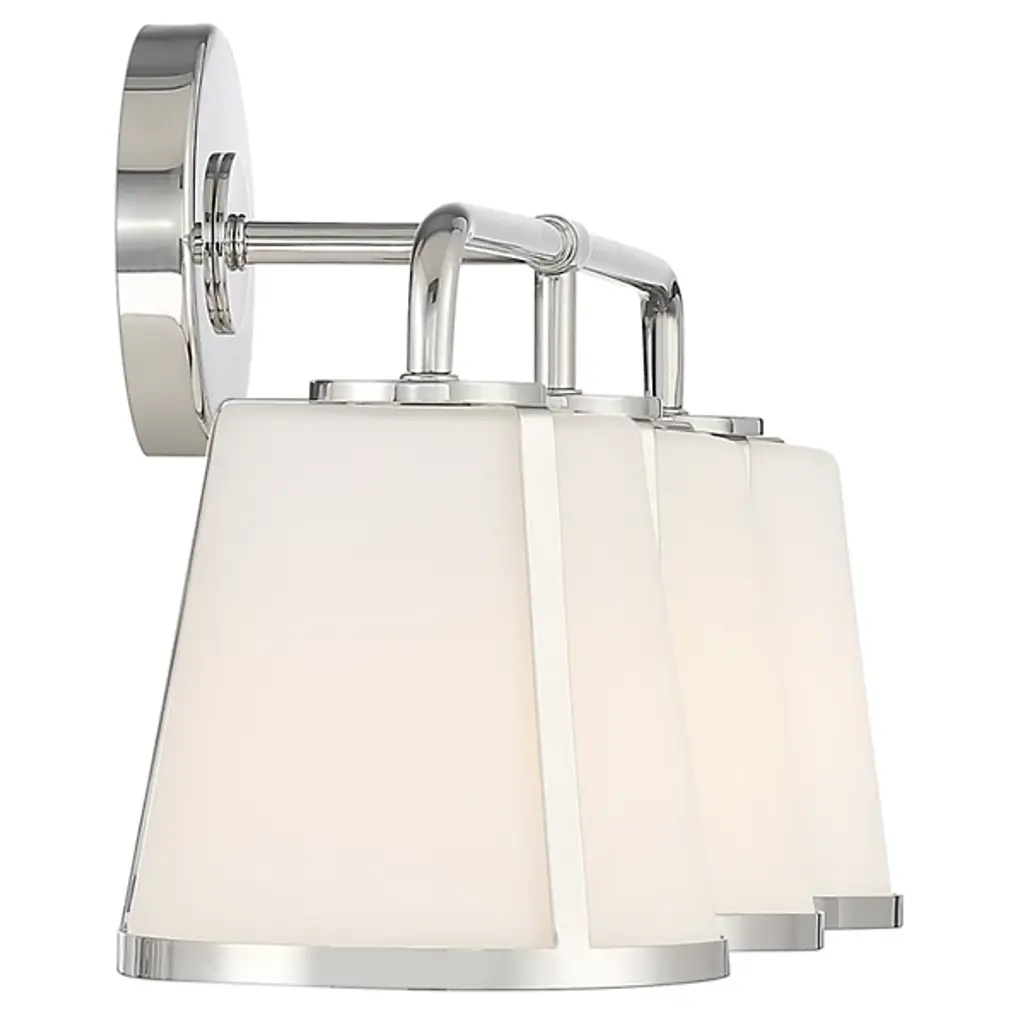 The tailored and versatile Fulton Vanity Light from Crystorama charms contrasting materials that create a bold display. This fixture features tapered glass shades that cast illumination downwards. The outpouring light provides a warm and cozy feeling. The smooth glass is wrapped in a metal ring with tailored lines that create an elegant contrast.