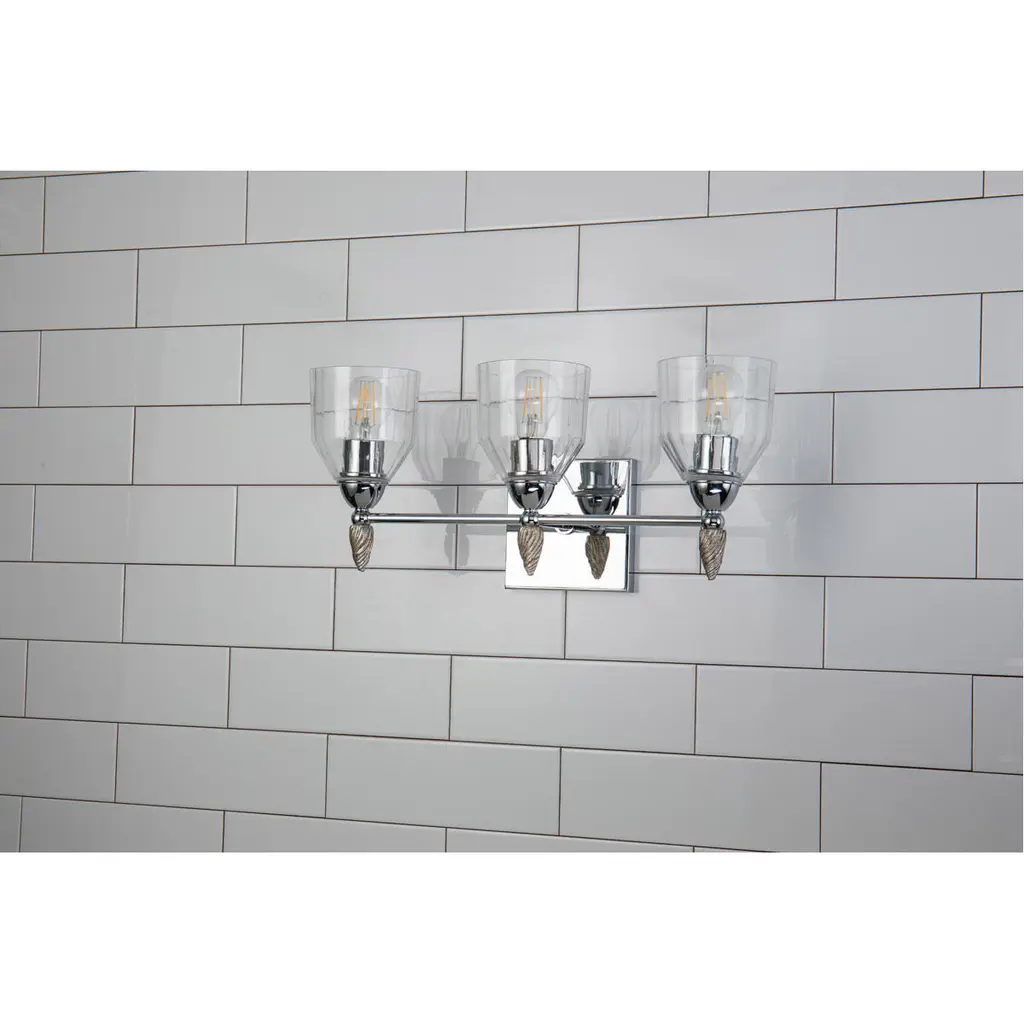 Drawing inspiration from a classic design, this silver 3-light vanity light is the perfect pick for any contemporary or traditional space. This fun finial design showcases a simple, rectangular 5" square backplate, dome shaped glass shade, and a decorative unique acorn-shaped gold finial. Easily installed over your mirror, this two-light sconce is suitable for damp spaces, and is finished in a beautiful polished chrome.