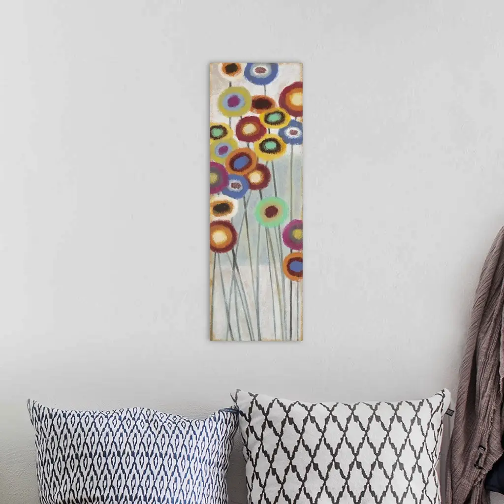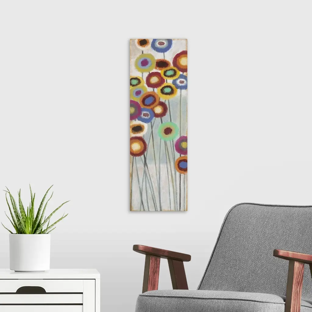 Contemporary abstract painting of colorful flowers on long stems.