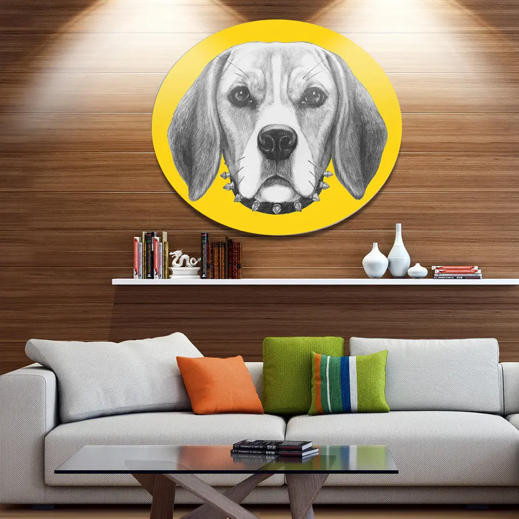 Bring Contemporary Abstraction to your home with this large Circle Metal wall art. This Funny Beagle Dog with Collar Metal Artwork makes it the focal point of any room or office. - White Gloss Coating ensures colors are extra vibrant with light reflection.- Aluminum grade Sheet Metal with 1 inch mounting frame on the back giving the illusion that the artwork is floating on the wall..- Mounting Brackets are included along with instructions.- High Quality Digital images are created directly into a glossy aluminum panel producing a stunning and captivating print into the glossy finish of the metal.- Water, Fire and Scratch resistant HD Aluminum panels.- Looks better than any photo paper and guaranteed to last at least 20 years- Easy to clean with a microfiber cloth. Colors are far superior to regular Canvas Art. - Easy to Hang