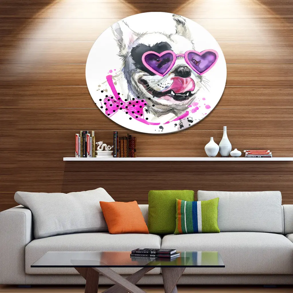 Bring Contemporary Abstraction to your home with this large Circle Metal wall art. This Funny Dog with Heart Glasses Metal Artwork makes it the focal point of any room or office. - White Gloss Coating ensures colors are extra vibrant with light reflection.- Aluminum grade Sheet Metal with 1 inch mounting frame on the back giving the illusion that the artwork is floating on the wall..- Mounting Brackets are included along with instructions.- High Quality Digital images are created directly into a glossy aluminum panel producing a stunning and captivating print into the glossy finish of the metal.- Water, Fire and Scratch resistant HD Aluminum panels.- Looks better than any photo paper and guaranteed to last at least 20 years- Easy to clean with a microfiber cloth. Colors are far superior to regular Canvas Art. - Easy to Hang