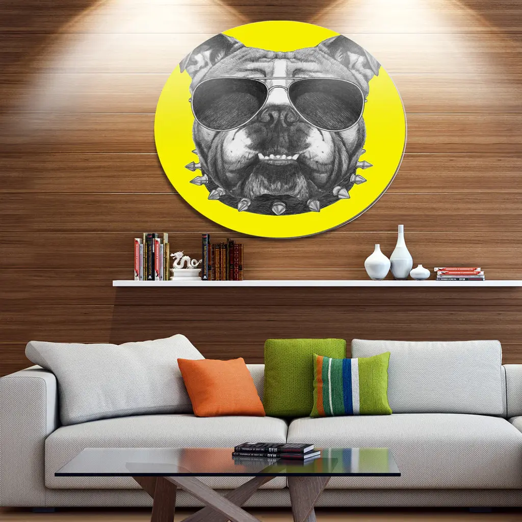 Bring Contemporary Abstraction to your home with this large Circle Metal wall art. This Funny English Bulldog with Collar Metal Artwork makes it the focal point of any room or office. - White Gloss Coating ensures colors are extra vibrant with light reflection.- Aluminum grade Sheet Metal with 1 inch mounting frame on the back giving the illusion that the artwork is floating on the wall..- Mounting Brackets are included along with instructions.- High Quality Digital images are created directly into a glossy aluminum panel producing a stunning and captivating print into the glossy finish of the metal.- Water, Fire and Scratch resistant HD Aluminum panels.- Looks better than any photo paper and guaranteed to last at least 20 years- Easy to clean with a microfiber cloth. Colors are far superior to regular Canvas Art. - Easy to Hang