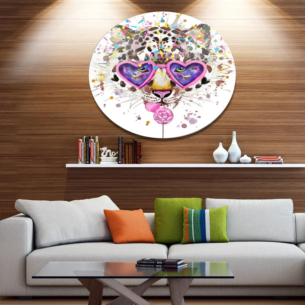 Bring Contemporary Abstraction to your home with this large Circle Metal wall art. This Funny Leopard with Heart Glasses Metal Artwork makes it the focal point of any room or office. - White Gloss Coating ensures colors are extra vibrant with light reflection.- Aluminum grade Sheet Metal with 1 inch mounting frame on the back giving the illusion that the artwork is floating on the wall..- Mounting Brackets are included along with instructions.- High Quality Digital images are created directly into a glossy aluminum panel producing a stunning and captivating print into the glossy finish of the metal.- Water, Fire and Scratch resistant HD Aluminum panels.- Looks better than any photo paper and guaranteed to last at least 20 years- Easy to clean with a microfiber cloth. Colors are far superior to regular Canvas Art. - Easy to Hang