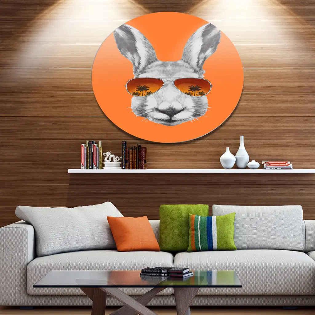 Bring Contemporary Abstraction to your home with this large Circle Metal wall art. This Funny Rabbit with Sunglasses Metal Artwork makes it the focal point of any room or office. - White Gloss Coating ensures colors are extra vibrant with light reflection.- Aluminum grade Sheet Metal with 1 inch mounting frame on the back giving the illusion that the artwork is floating on the wall..- Mounting Brackets are included along with instructions.- High Quality Digital images are created directly into a glossy aluminum panel producing a stunning and captivating print into the glossy finish of the metal.- Water, Fire and Scratch resistant HD Aluminum panels.- Looks better than any photo paper and guaranteed to last at least 20 years- Easy to clean with a microfiber cloth. Colors are far superior to regular Canvas Art. - Easy to Hang