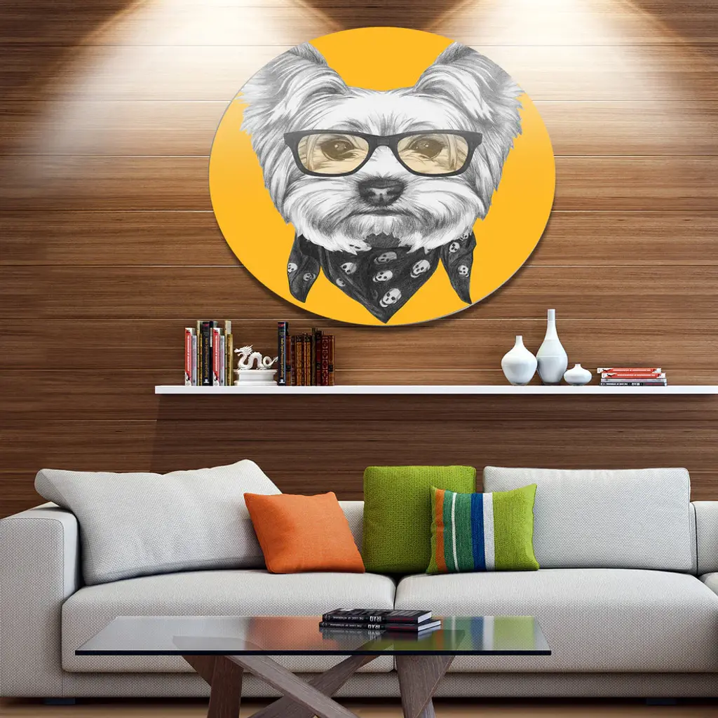 Bring Contemporary Abstraction to your home with this large Circle Metal wall art. This Funny Terrier Dog with Glasses Metal Artwork makes it the focal point of any room or office. - White Gloss Coating ensures colors are extra vibrant with light reflection.- Aluminum grade Sheet Metal with 1 inch mounting frame on the back giving the illusion that the artwork is floating on the wall..- Mounting Brackets are included along with instructions.- High Quality Digital images are created directly into a glossy aluminum panel producing a stunning and captivating print into the glossy finish of the metal.- Water, Fire and Scratch resistant HD Aluminum panels.- Looks better than any photo paper and guaranteed to last at least 20 years- Easy to clean with a microfiber cloth. Colors are far superior to regular Canvas Art. - Easy to Hang