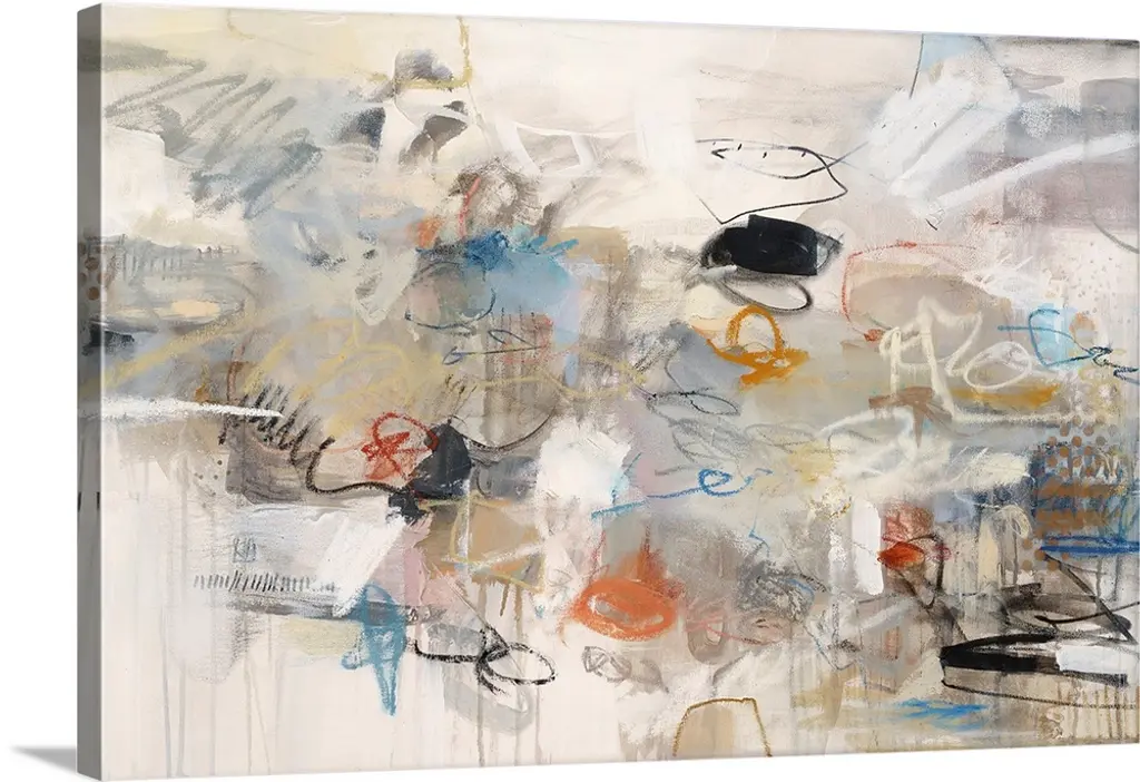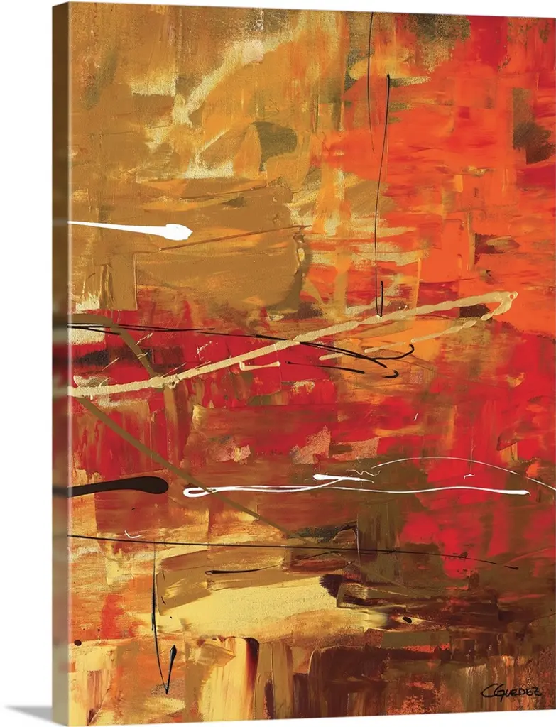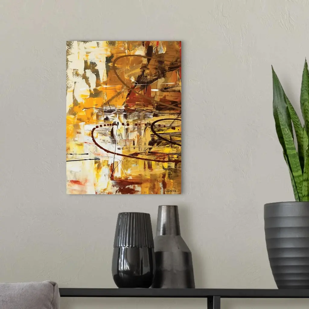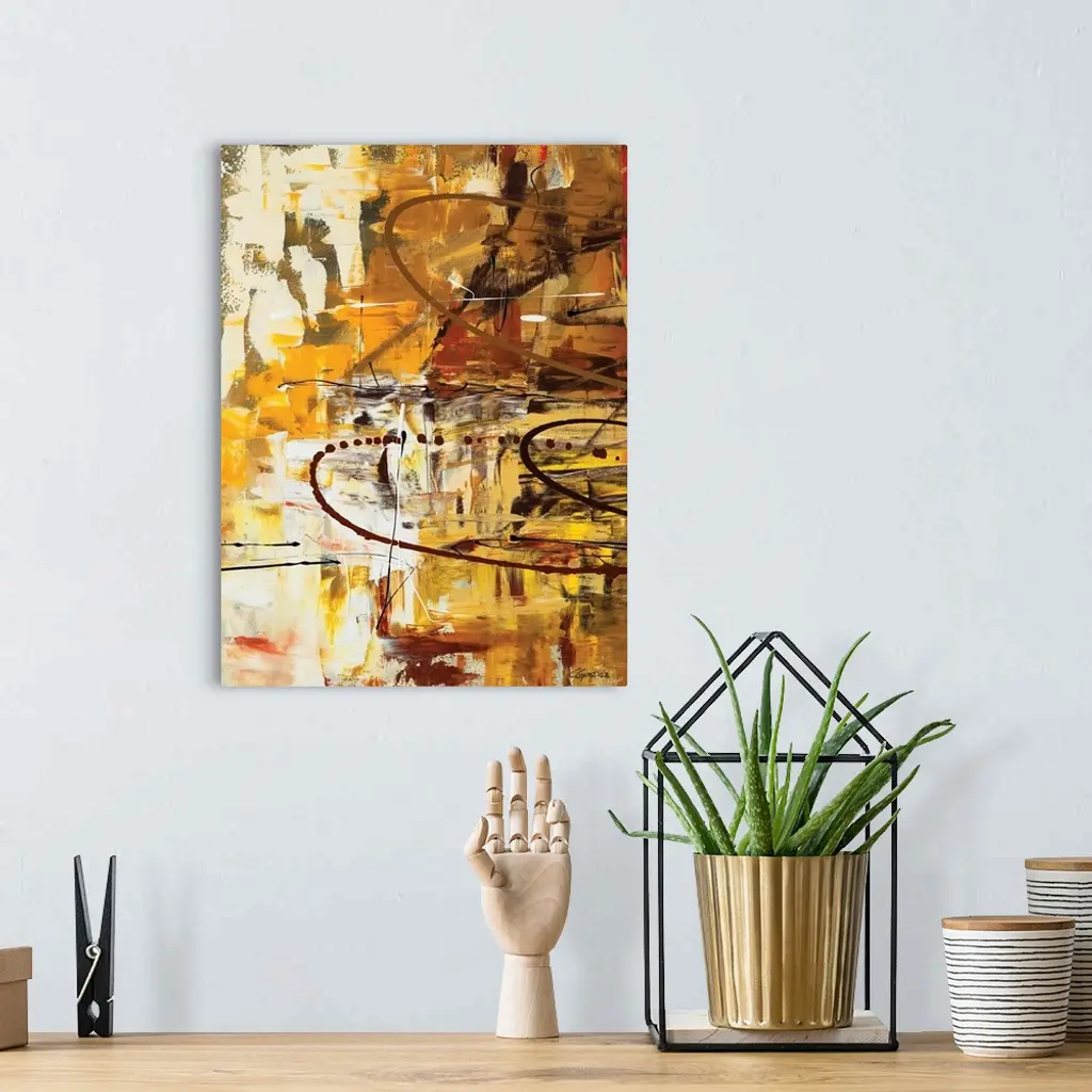 Modern abstract painting in shades of brown, yellow, and white with thin sideways arched lines on the side.