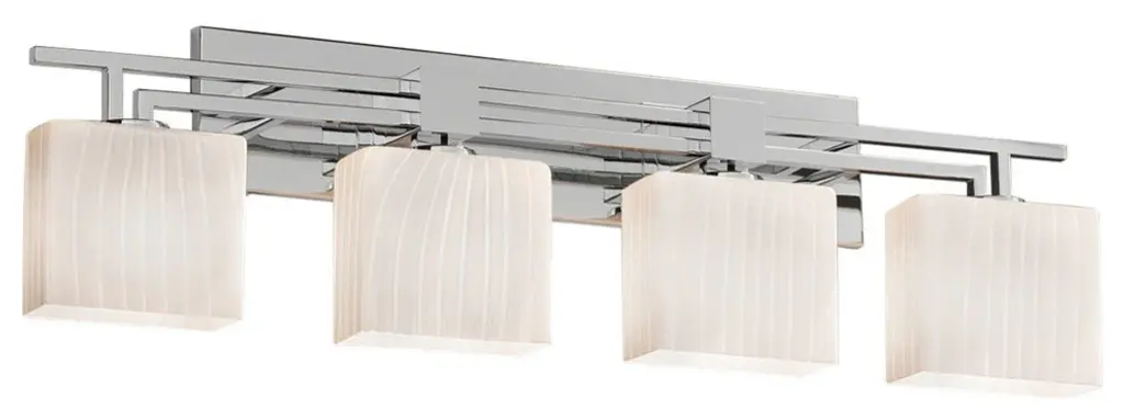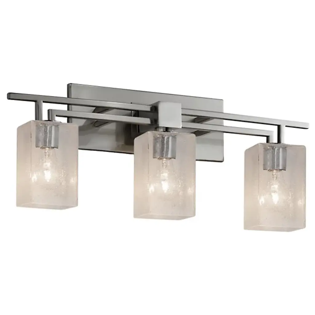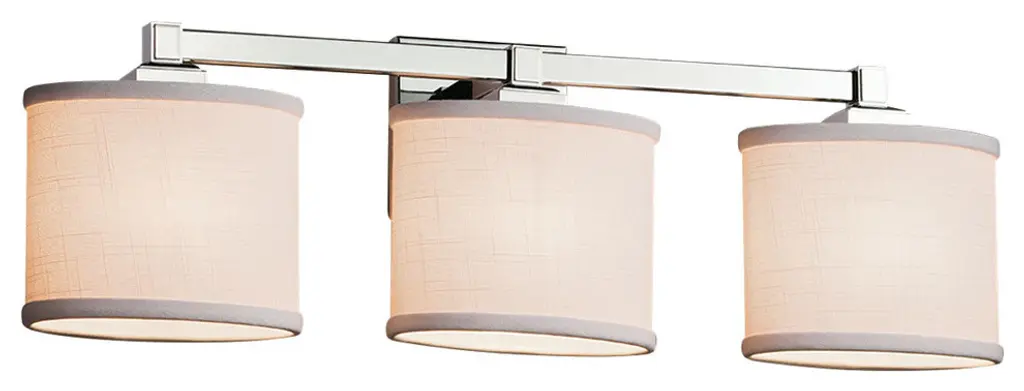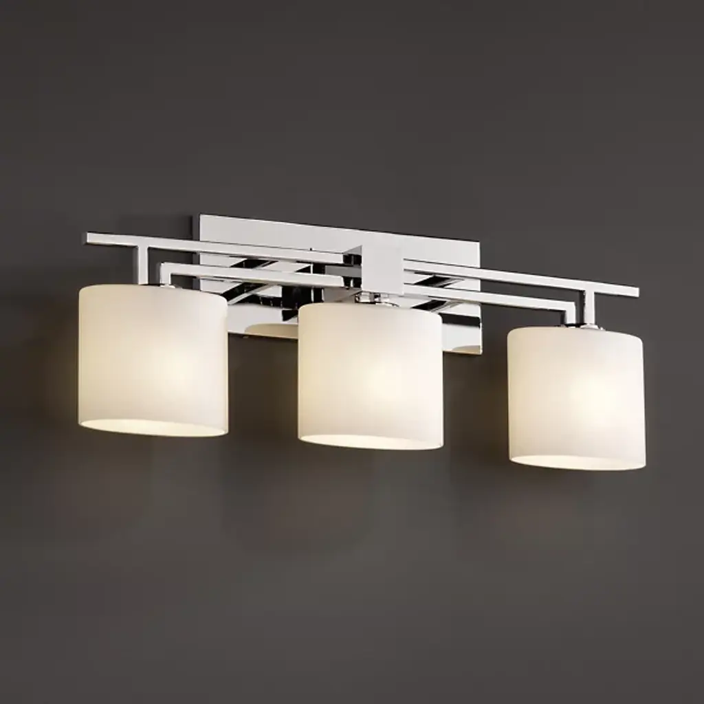 The Fusion Aero Vanity Light by Justice Design Group introduces a handsome standout contemporary flavor to any bath or vanity space. It does that by combining simple forms and strong lines, defined by its hand crafted Metal frame and three light design. Each light is capped with a textured Artisan Glass diffuser shade in an oval pattern that helps to soften light, creating a defined atmosphere that’s bright and welcoming. A warm and welcoming approach to modern design, this bath bar is a tasteful way to light bath mirrors or accent tub spaces with ease. It’s a must have for introducing a soft contemporary look to any home.