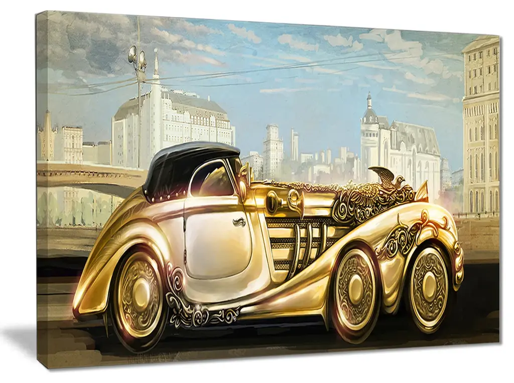 The Futuristic Gold Machine canvas art print is sure to make an impression on anyone who sees it. This artwork is gallery wrapped around a 1-inch solid wood frame and arrives carefully packaged and entirely ready to hang on the wall. Design Art only uses the highest resolution and pigments to ensure a crisp colorful print that is never faded or pixelated. This artwork is sure to be a conversation starter in any home or office.