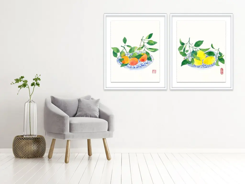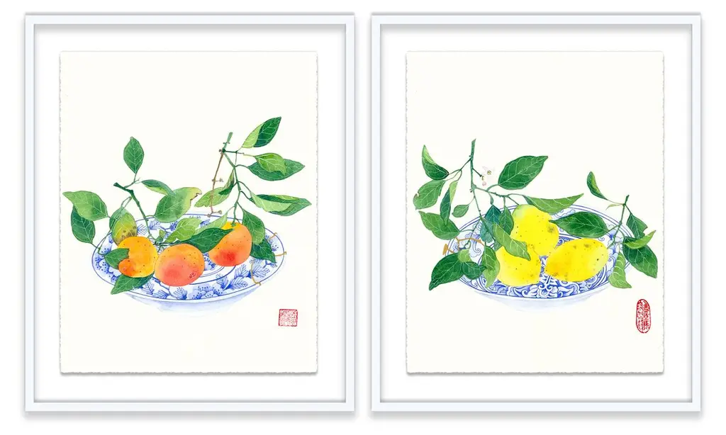 Seen first at One Kings Lane: This still life set Gabby Malpas brings any wall to life with bowls of ripe fruit that pop in vivid color against a neutral background. Each piece is printed on high-quality paper with deckled edges, floated over a mat, and displayed in a simple wood frame. Arrives ready to hang.Gabby Malpas creates joyful, intricate watercolor works. Locally grown flowers and fruits picked nearby are rendered with tender warmth, often borrowing from the delicate aesthetics of Chinese ceramics and Southeast Asian batik fabrics. She works on high-quality art paper which she sometimes stitches together to add texture. Gabby trained as a ceramicist in New Zealand and has lived for many years in the UK. She now resides in Sydney, Australia.