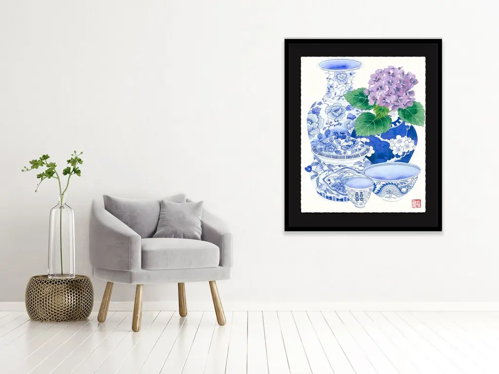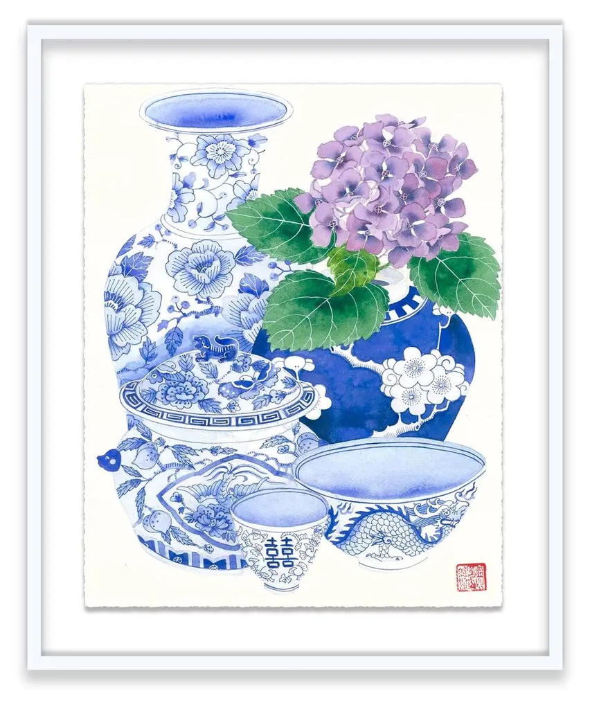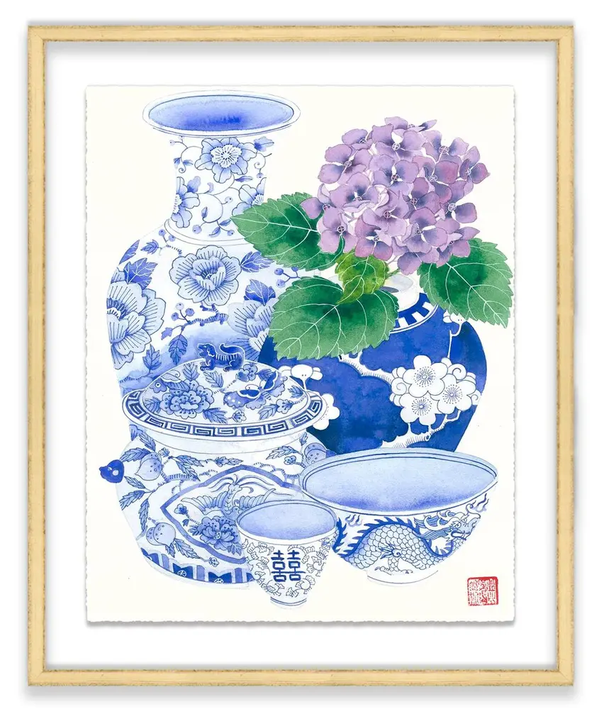 Seen first at One Kings Lane: This work from Gabby Malpas brings any wall to life with its vibrant florals and detailed porcelain vessels. Printed on high-quality paper with deckled edges, floated over a mat, and displayed in a simple wood frame, this piece arrives ready to hang.Gabby Malpas creates joyful, intricate watercolor works. Locally grown flowers and fruits picked nearby are rendered with tender warmth, often borrowing from the delicate aesthetics of Chinese ceramics and Southeast Asian batik fabrics. She works on high-quality art paper which she sometimes stitches together to add texture. Gabby trained as a ceramicist in New Zealand and has lived for many years in the UK. She now resides in Sydney, Australia.